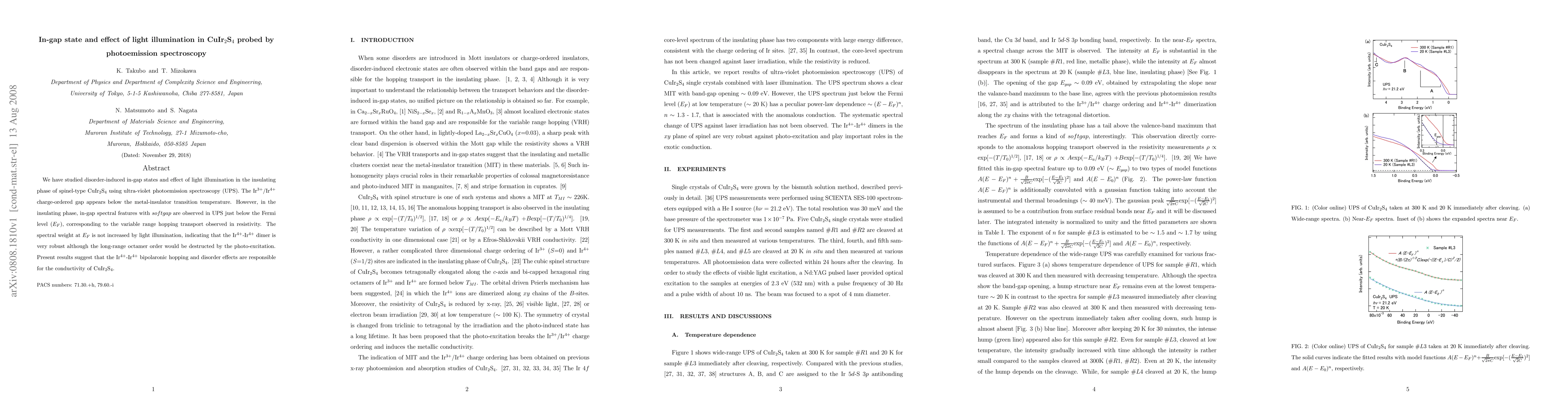 The study uses ultra-violet photoemission spectroscopy (UPS) to investigate in-gap states and light illumination effects in the insulating phase of CuIr$_2$S$_4$. It reveals that despite photo-excitation disrupting long-range octamer order, the Ir$^{4+}$-Ir$^{4+}$ dimer remains robust. The findings suggest that Ir$^{4+}$-Ir$^{4+}$ bipolaronic hopping and disorder contribute to the compound's conductivity.