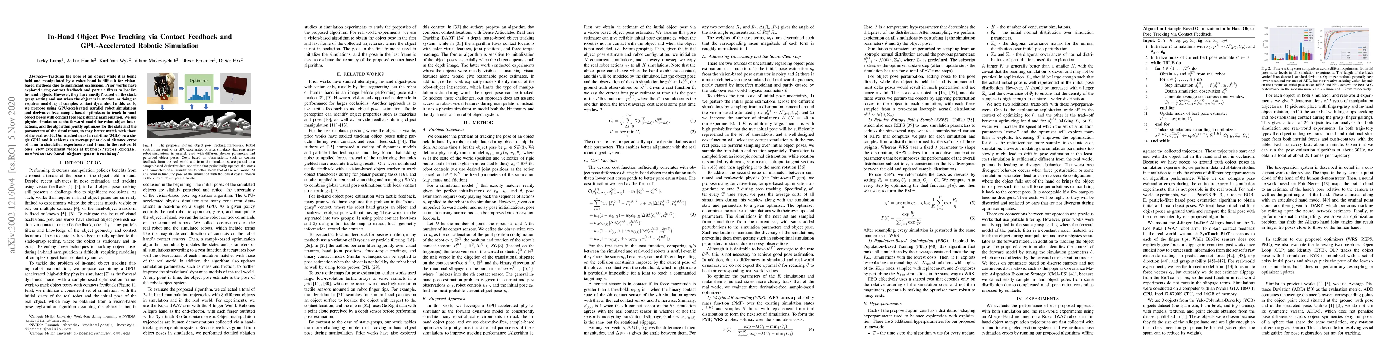 Tracking the pose of an object while it is being held and manipulated by a robot hand is difficult for vision-based methods due to significant occlusions. Prior works have explored using contact feedback and particle filters to localize in-hand objects. However, they have mostly focused on the static grasp setting and not when the object is in motion, as doing so requires modeling of complex contact dynamics. In this work, we propose using GPU-accelerated parallel robot simulations and derivative-free, sample-based optimizers to track in-hand object poses with contact feedback during manipulation. We use physics simulation as the forward model for robot-object interactions, and the algorithm jointly optimizes for the state and the parameters of the simulations, so they better match with those of the real world. Our method runs in real-time (30Hz) on a single GPU, and it achieves an average point cloud distance error of 6mm in simulation experiments and 13mm in the real-world ones. View experiment videos at https://sites.google.com/view/in-hand-object-pose-tracking/