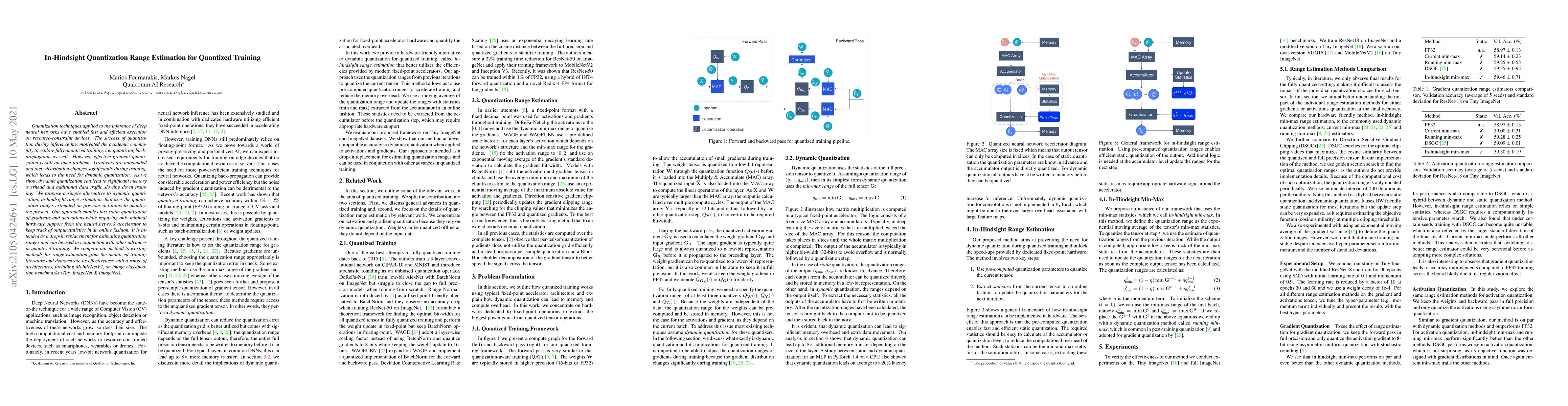 This paper proposes an in-hindsight quantization range estimation method for fully quantized training of deep neural networks, aiming to address the challenges of dynamic quantization. It introduces a simple, static alternative that uses previous iteration ranges to quantize gradients and activations, minimizing memory overhead and data traffic.