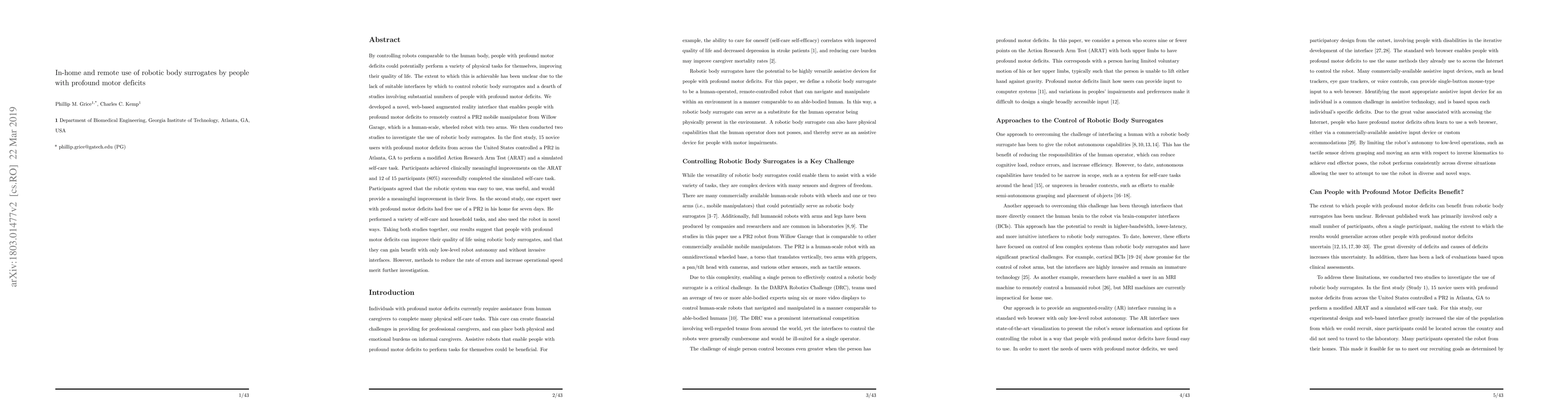This study developed a web-based augmented reality interface for people with profound motor deficits to control a PR2 robot remotely, showing significant improvements in self-care tasks and quality of life. Further research is needed to reduce errors and increase operational speed.