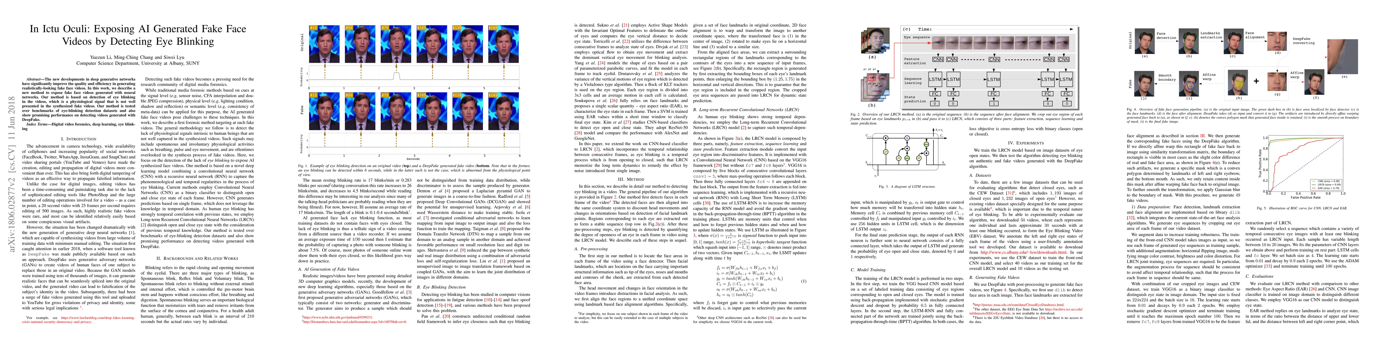 This paper proposes a novel method to detect AI-generated fake face videos using eye blinking detection, as synthesized videos lack realistic physiological signals. The method shows promising performance on benchmark datasets and effectively identifies DeepFake videos.