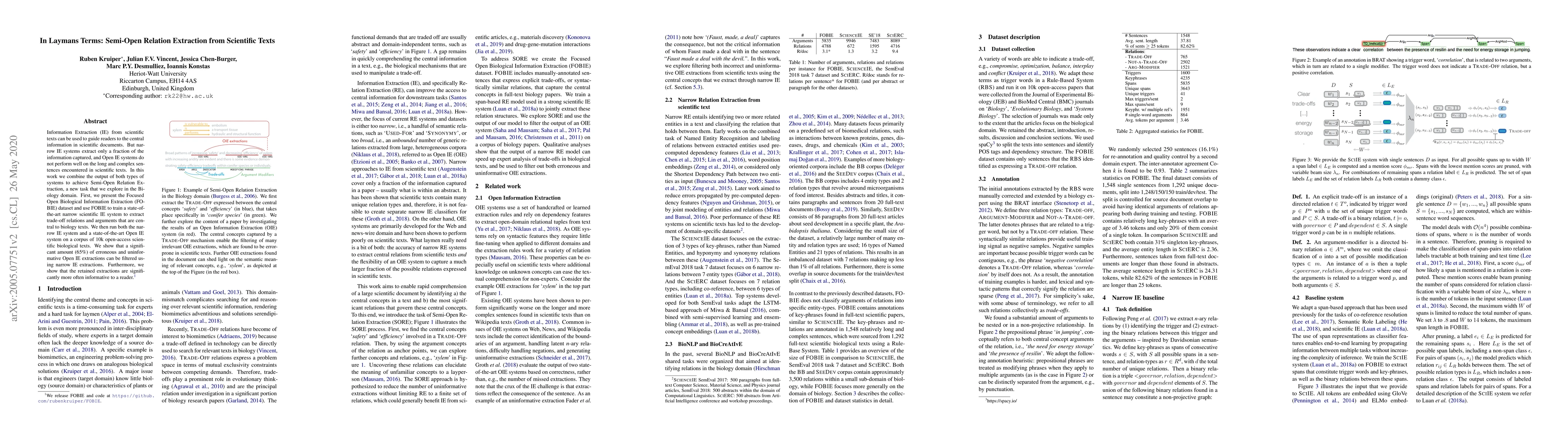 Information Extraction (IE) from scientific texts can be used to guide readers to the central information in scientific documents. But narrow IE systems extract only a fraction of the information captured, and Open IE systems do not perform well on the long and complex sentences encountered in scientific texts. In this work we combine the output of both types of systems to achieve Semi-Open Relation Extraction, a new task that we explore in the Biology domain. First, we present the Focused Open Biological Information Extraction (FOBIE) dataset and use FOBIE to train a state-of-the-art narrow scientific IE system to extract trade-off relations and arguments that are central to biology texts. We then run both the narrow IE system and a state-of-the-art Open IE system on a corpus of 10k open-access scientific biological texts. We show that a significant amount (65%) of erroneous and uninformative Open IE extractions can be filtered using narrow IE extractions. Furthermore, we show that the retained extractions are significantly more often informative to a reader.