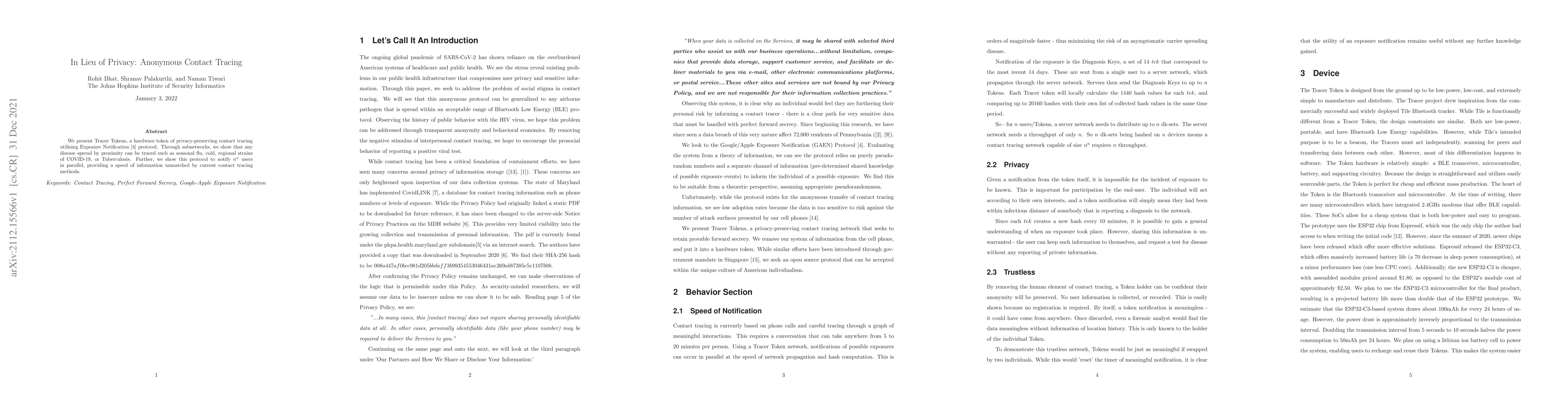 We present Tracer Tokens, a hardware token of privacy-preserving contact tracing utilizing Exposure Notification \cite{GAEN} protocol. Through subnetworks, we show that any disease spread by proximity can be traced such as seasonal flu, cold, regional strains of COVID-19, or Tuberculosis. Further, we show this protocol to notify $n^n$ users in parallel, providing a speed of information unmatched by current contact tracing methods.