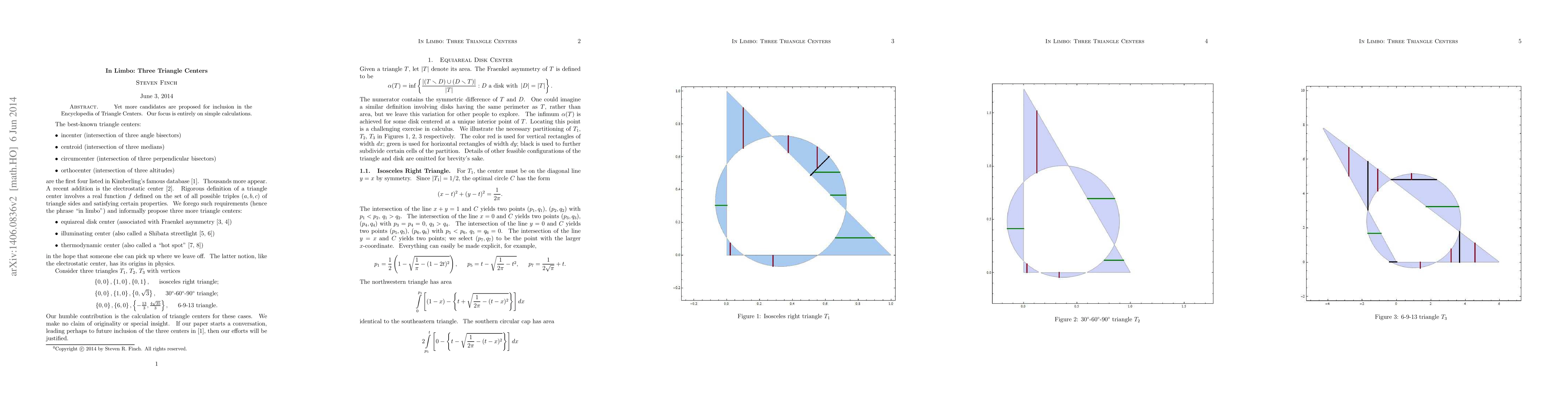 The paper proposes new triangle centers through simple calculations, focusing on three specific triangles (1.2.30°-60°-90°, 6-9-13, and 6-9-13 triangle) by determining optimal circle intersections and maximizing brightness integral under certain conditions.