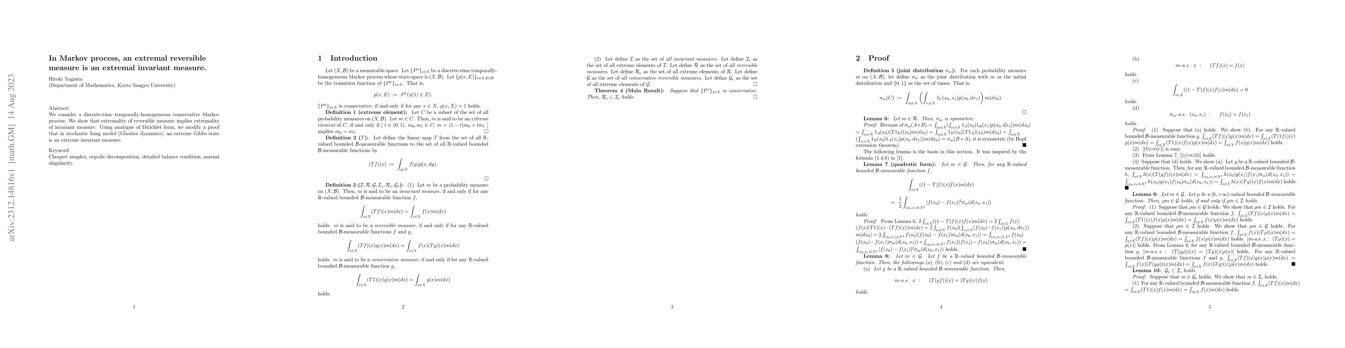 Summary: This paper demonstrates that in a discrete-time, temporally-homogeneous conservative Markov process, an extremal reversible measure is also an extremal invariant measure. The proof is adapted from the stochastic Ising model using an analogue of the Dirichlet form.