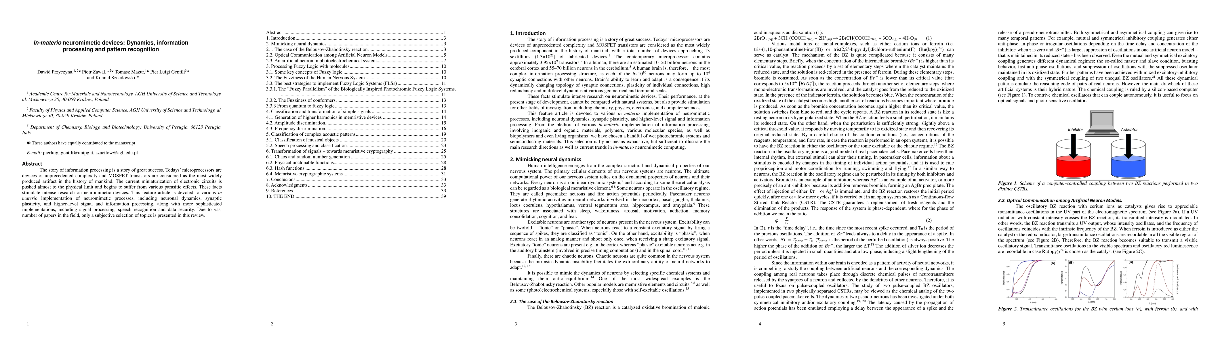 The story of information processing is a story of great success. Todays' microprocessors are devices of unprecedented complexity and MOSFET transistors are considered as the most widely produced artifact in the history of mankind. The current miniaturization of electronic circuits is pushed almost to the physical limit and begins to suffer from various parasitic effects. These facts stimulate intense research on neuromimetic devices. This feature article is devoted to various in materio implementation of neuromimetic processes, including neuronal dynamics, synaptic plasticity, and higher-level signal and information processing, along with more sophisticated implementations, including signal processing, speech recognition and data security. Due to vast number of papers in the field, only a subjective selection of topics is presented in this review.
