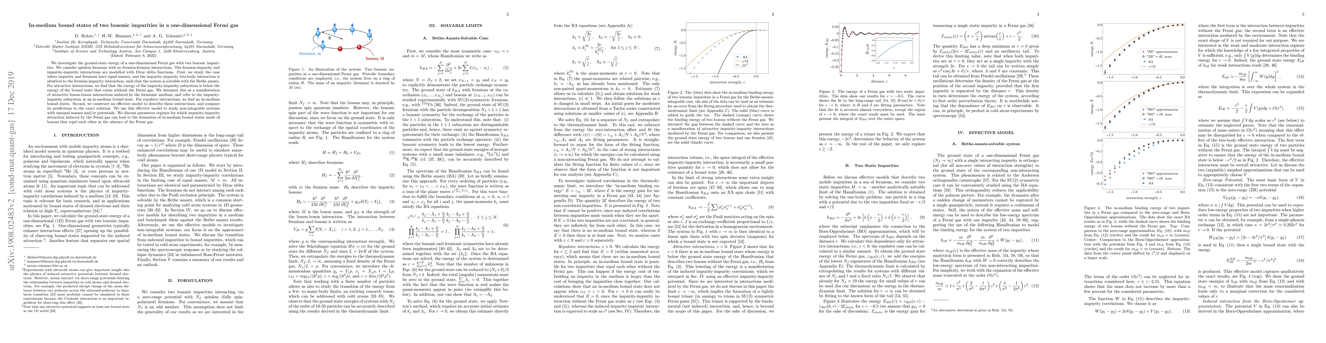 This paper investigates the ground-state energy of a one-dimensional Fermi gas with two bosonic impurities, finding that attractive interactions can induce in-medium bound states between the impurities. An effective model is used to explore scenarios with unequal masses and potentials, revealing conditions for impurity-impurity attraction in the presence of the Fermi gas.