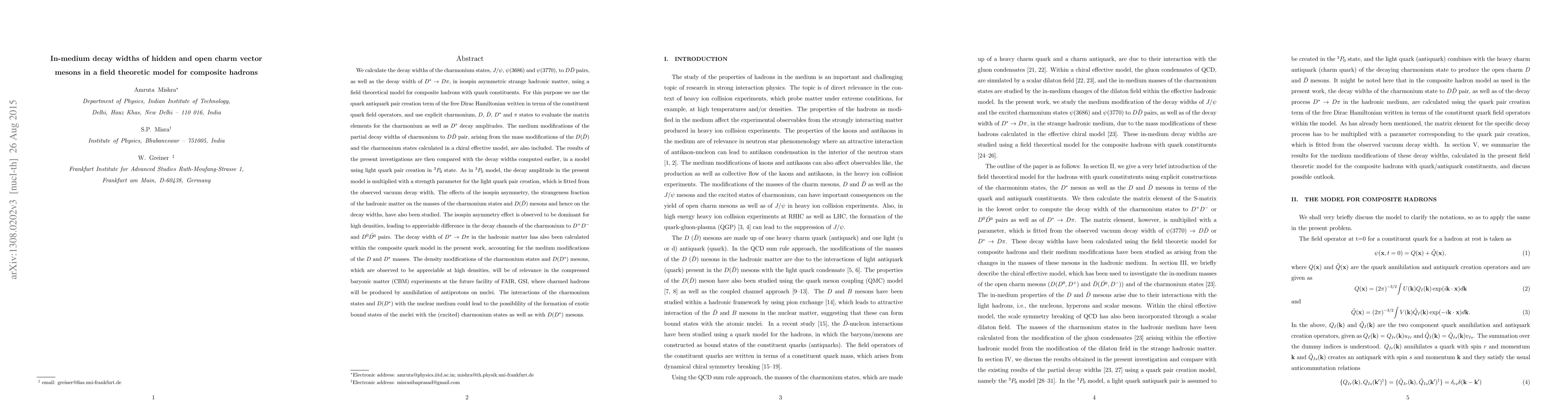 We calculate the decay widths of the charmonium states, $J/\psi$, $\psi (3686)$ and $\psi(3770)$, to $D\bar D$ pairs, as well as the decay width of $D^* \rightarrow D\pi$, in isospin asymmetric strange hadronic matter, using a field theoretical model for composite hadrons with quark constituents. For this purpose we use the quark antiquark pair creation term of the free Dirac Hamiltonian written in terms of the constituent quark field operators, and use explicit charmonium, $D$, $\bar {D}$, $D^*$ and $\pi$ states to evaluate the matrix elements for the charmonium as well as $D^*$ decay amplitudes. The medium modifications of the partial decay widths of charmonium to $D\bar D$ pair, arising from the mass modifications of the $D(\bar D)$ and the charmonium states calculated in a chiral effective model, are also included. The effects of the isospin asymmetry, the strangeness fraction of the hadronic matter on the masses of the charmonium states and $D(\bar D)$ mesons and hence on the decay widths, have also been studied. The decay width of $D^* \rightarrow D \pi$ in the hadronic matter has also been calculated within the composite quark model in the present work, accounting for the medium modifications of the $D$ and $D^*$ masses. The density modifications of the charmonium states and $D(D^*)$ mesons, which are observed to be appreciable at high densities, will be of relevance in the compressed baryonic matter (CBM) experiments at the future facility of FAIR, GSI, where charmed hadrons will be produced by annihilation of antiprotons on nuclei. The interactions of the charmonium states and $D(D^*)$ with the nuclear medium could lead to the possiblility of the formation of exotic bound states of the nuclei with the (excited) charmonium states as well as with $D(D^*)$ mesons.