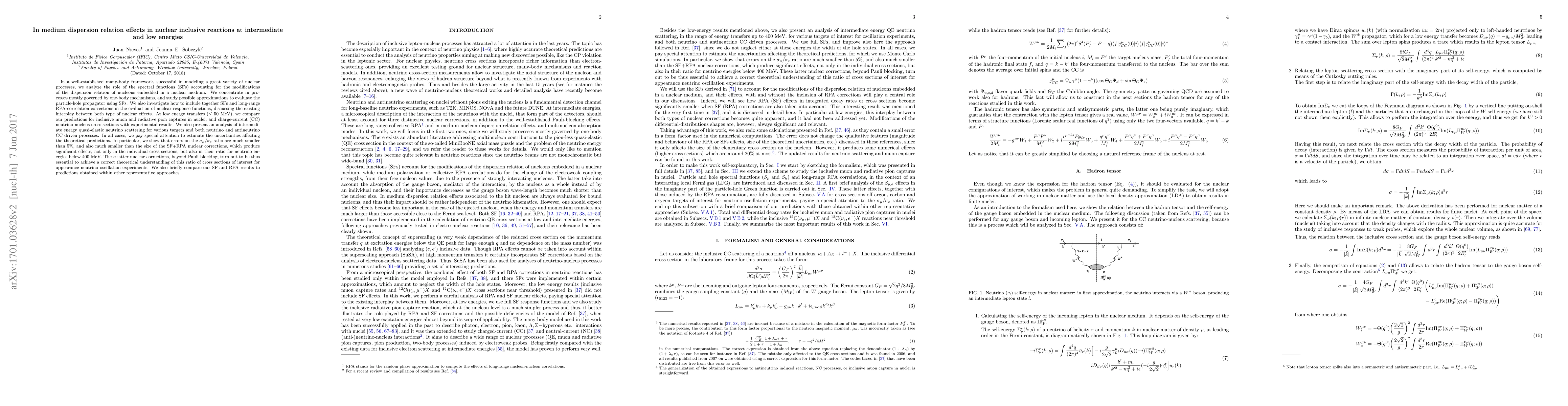 In a well-established many-body framework, successful in modeling a great variety of nuclear processes, we analyze the role of the spectral functions (SFs) accounting for the modifications of the dispersion relation of nucleons embedded in a nuclear medium. We concentrate in processes mostly governed by one-body mechanisms, and study possible approximations to evaluate the particle-hole propagator using SFs. We also investigate how to include together SFs and long-range RPA-correlation corrections in the evaluation of nuclear response functions, discussing the existing interplay between both type of nuclear effects. At low energy transfers (\le 50 MeV), we compare our predictions for inclusive muon and radiative pion captures in nuclei, and charge-current (CC) neutrino-nucleus cross sections with experimental results. We also present an analysis of intermediate energy quasi-elastic neutrino scattering for various targets and both neutrino and antineutrino CC driven processes. In all cases, we pay special attention to estimate the uncertainties affecting the theoretical predictions. In particular, we show that errors on the \sigma_{\mu}/\sigma_e ratio are much smaller than 5%, and also much smaller than the size of the SF+RPA nuclear corrections, which produce significant effects, not only in the individual cross sections, but also in their ratio for neutrino energies below 400 MeV. These latter nuclear corrections, beyond Pauli blocking, turn out to be thus essential to achieve a correct theoretical understanding of this ratio of cross sections of interest for appearance neutrino oscillation experiments. We also briefly compare our SF and RPA results to predictions obtained within other representative approaches.