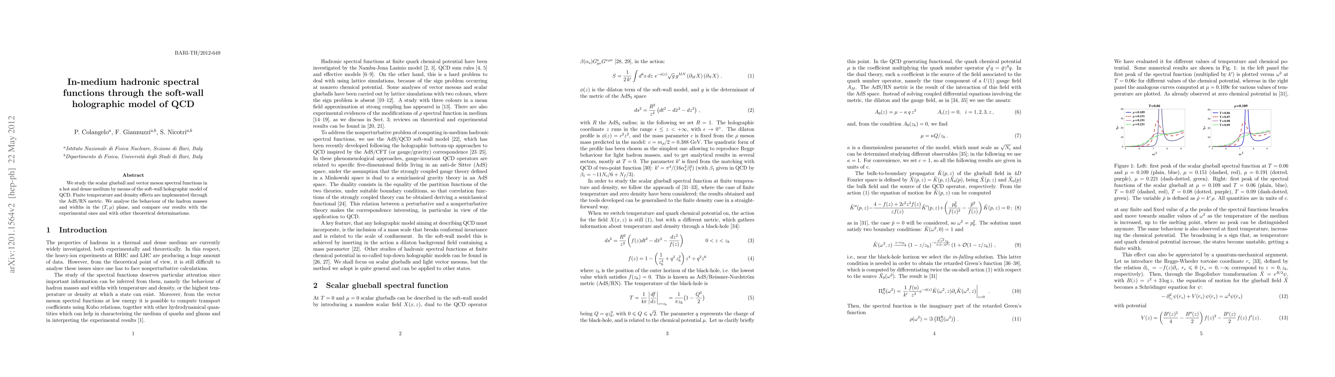 We study the scalar glueball and vector meson spectral functions in a hot and dense medium by means of the soft-wall holographic model of QCD. Finite temperature and density effects are implemented through the AdS/RN metric. We analyse the behaviour of the hadron masses and widths in the $(T,\mu)$ plane, and compare our results with the experimental ones and with other theoretical determinations.