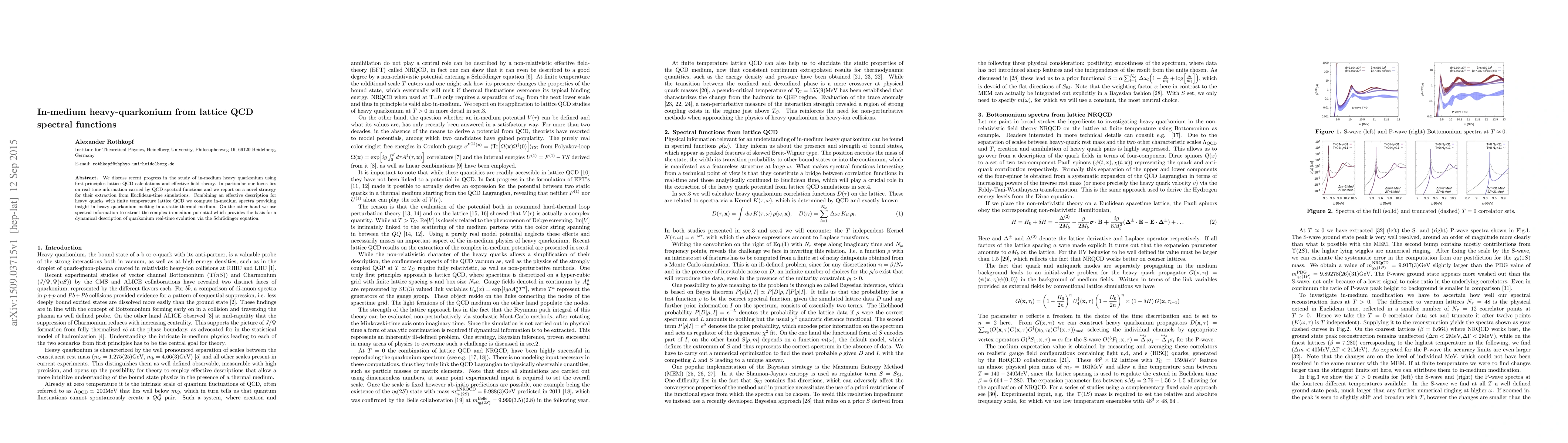We discuss recent progress in the study of in-medium heavy quarkonium using first-principles lattice QCD calculations and effective field theory. In particular our focus lies on real-time information carried by QCD spectral functions and we report on a novel strategy for their extraction from Euclidean-time simulations. Combining an effective description for heavy quarks with finite temperature lattice QCD we compute in-medium spectra providing insight in heavy quarkonium melting in a static thermal medium. On the other hand we use spectral information to extract the complex in-medium potential which provides the basis for a dynamical description of quarkonium real-time evolution via the Schr\"odinger equation.