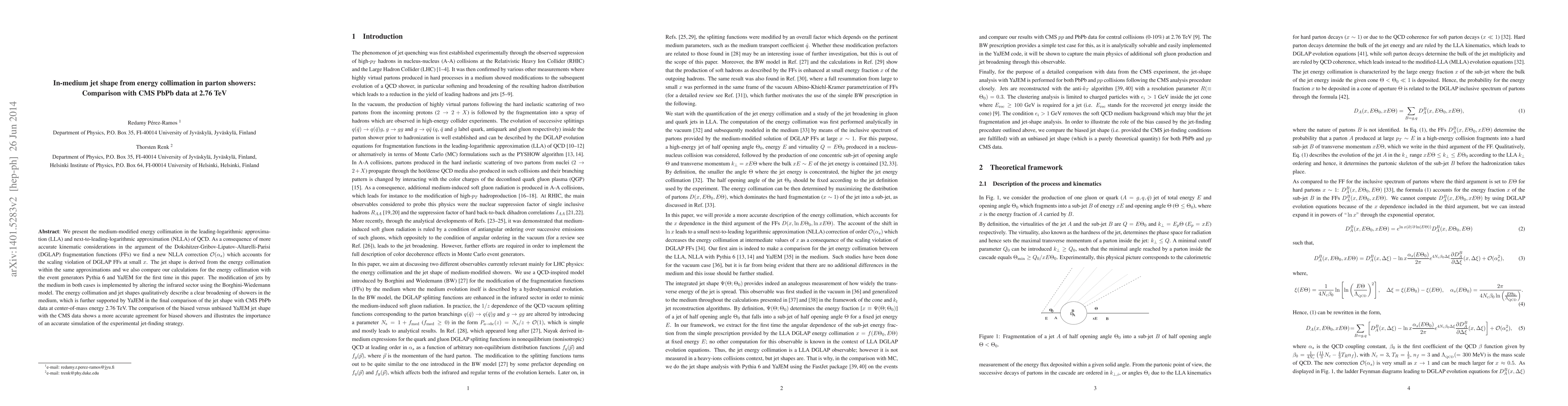 We present the medium-modified energy collimation in the leading-logarithmic approximation (LLA) and next-to-leading-logarithmic approximation (NLLA) of QCD. As a consequence of more accurate kinematic considerations in the argument of the Dokshitzer-Gribov-Lipatov-Altarelli-Parisi (DGLAP) fragmentation functions (FFs) we find a new NLLA correction ${\cal O}(\alpha_s)$ which accounts for the scaling violation of DGLAP FFs at small $x$. The jet shape is derived from the energy collimation within the same approximations and we also compare our calculations for the energy collimation with the event generators Pythia 6 and YaJEM for the first time in this paper. The modification of jets by the medium in both cases is implemented by altering the infrared sector using the Borghini-Wiedemann model. The energy collimation and jet shapes qualitatively describe a clear broadening of showers in the medium, which is further supported by YaJEM in the final comparison of the jet shape with CMS PbPb data at center-of-mass energy 2.76 TeV. The comparison of the biased versus unbiased YaJEM jet shape with the CMS data shows a more accurate agreement for biased showers and illustrates the importance of an accurate simulation of the experimental jet-finding strategy.