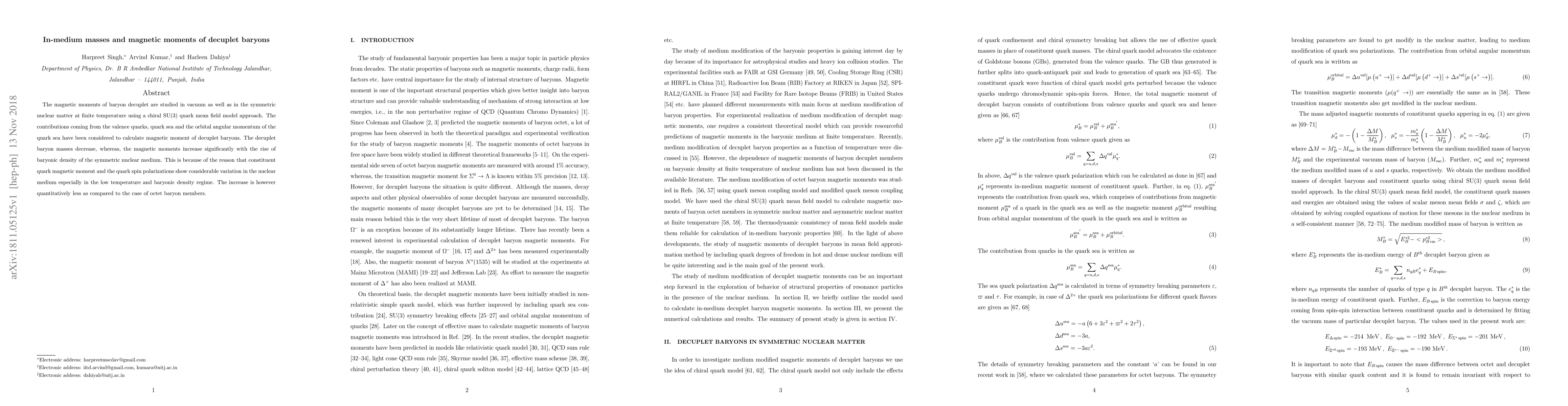 This study investigates the magnetic moments and masses of decuplet baryons in vacuum and symmetric nuclear matter using a chiral SU(3) quark mean field model. Results show that decuplet baryon masses decrease while magnetic moments increase significantly with rising baryonic density, due to variations in constituent quark magnetic moments and spin polarizations in the nuclear medium.