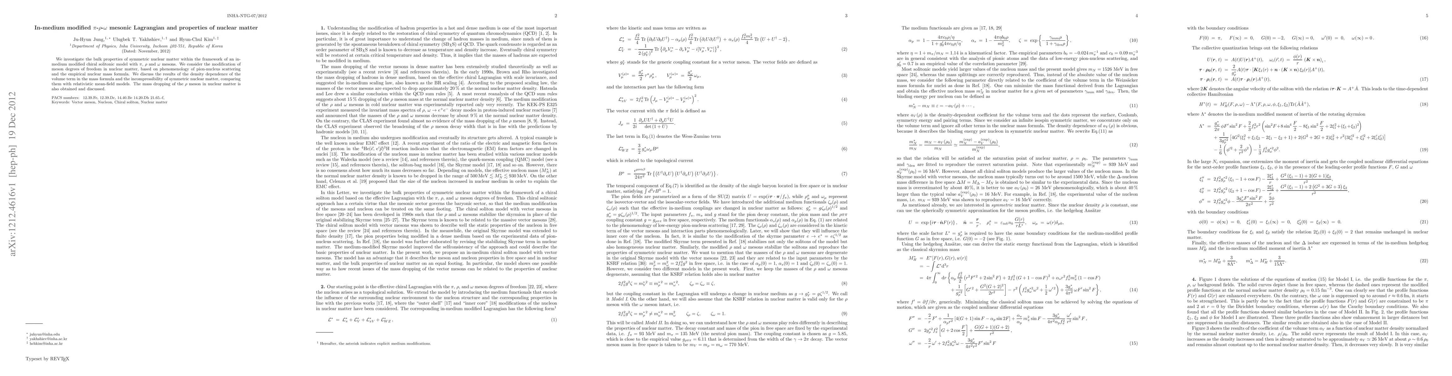This paper explores the bulk properties of symmetric nuclear matter using an in-medium modified chiral solitonic model incorporating $\pi$, $\rho$, and $\omega$ mesons. It examines the density-dependent volume term and incompressibility, comparing results with relativistic mean-field models and discusses the mass dropping of the $\rho$ meson in nuclear matter.