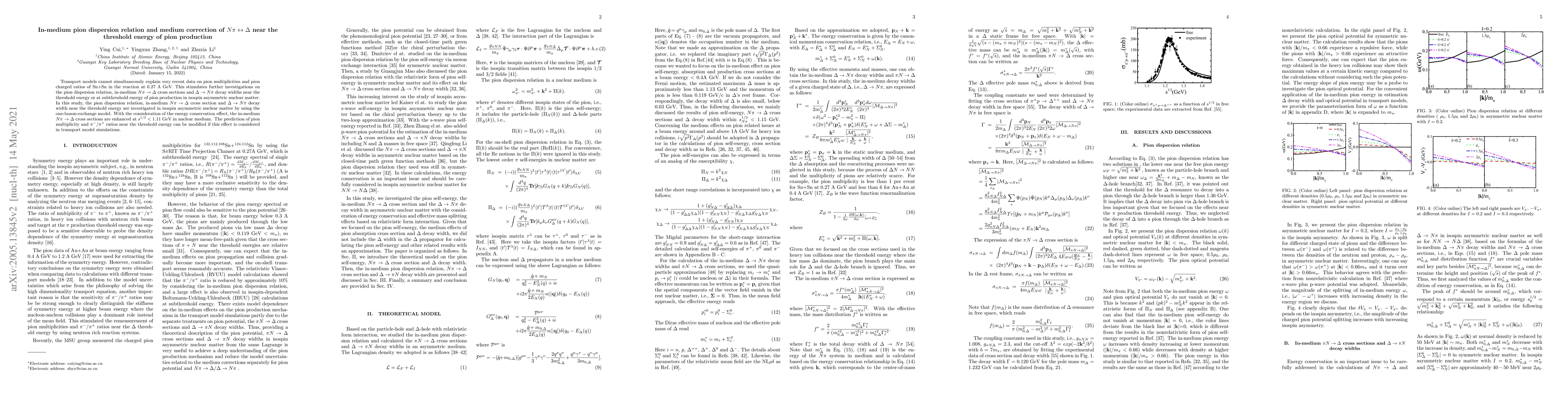 This paper investigates the pion dispersion relation and in-medium $N\pi\to \Delta$ cross sections in isospin asymmetric nuclear matter, finding that energy conservation enhances the cross sections at subthreshold energies, which could modify predictions for pion multiplicity and $\pi^-/\pi^+$ ratios in transport models.