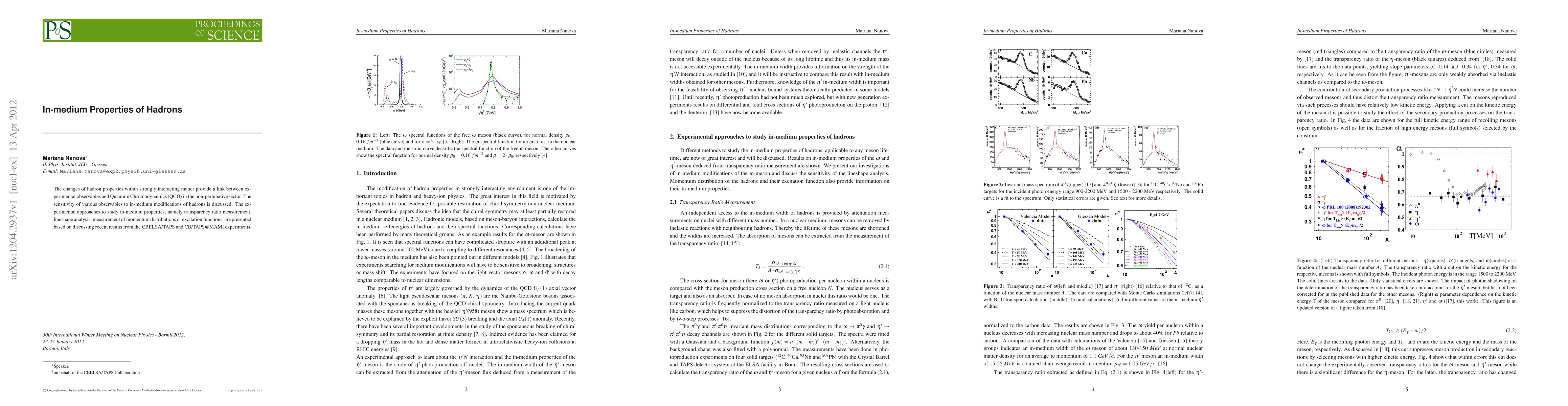 This paper explores how hadron properties change within strongly interacting matter, providing a bridge between QCD and experimental observables. It discusses various experimental methods, including transparency ratio measurements, to investigate these in-medium modifications, based on recent findings from CBELSA/TAPS and CB/TAPS@MAMI experiments.