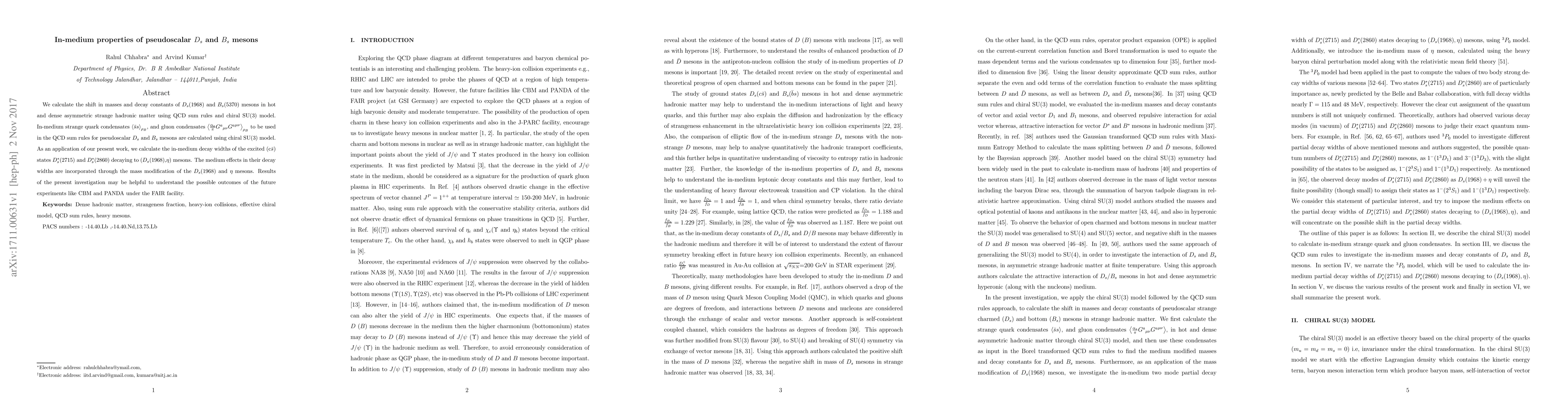 We calculate the shift in masses and decay constants of $D_s(1968)$ and $B_s(5370)$ mesons in hot and dense asymmetric strange hadronic matter using QCD sum rules and chiral SU(3) model. In-medium strange quark condensates $\left\langle \bar{s}s\right\rangle_{\rho_B}$, and gluon condensates $\left\langle \frac{\alpha_{s}}{\pi} {G^a}_{\mu\nu} {G^a}^{\mu\nu} \right\rangle_{\rho_B}$ to be used in the QCD sum rules for pseudoscalar $D_s$ and $B_s$ mesons are calculated using chiral SU(3) model. As an application of our present work, we calculate the in-medium decay widths of the excited (c$\bar{s}$) states $D_s^*(2715)$ and $D_s^*(2860)$ decaying to ($D_s(1968)$,$\eta$) mesons. The medium effects in their decay widths are incorporated through the mass modification of the $D_s(1968)$ and $\eta$ mesons. Results of the present investigation may be helpful to understand the possible outcomes of the future experiments like CBM and PANDA under the FAIR facility.