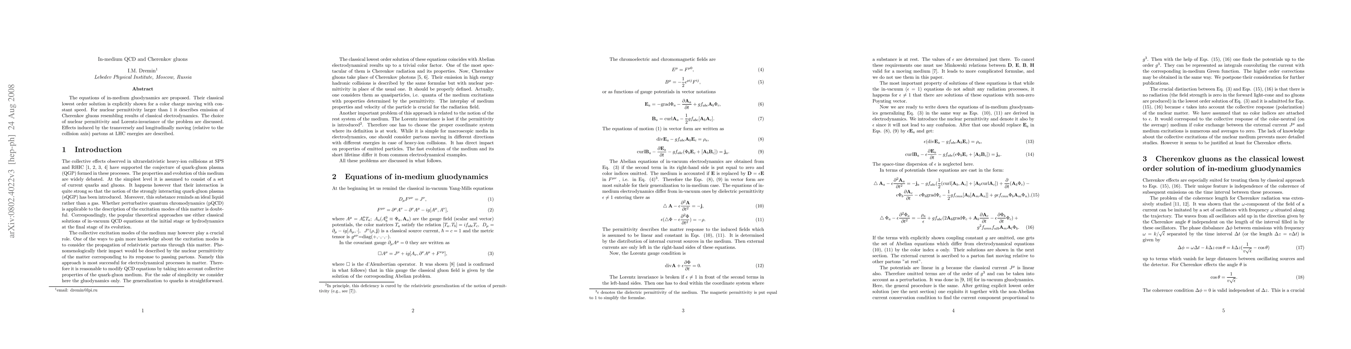 This paper proposes equations for in-medium gluodynamics and demonstrates their classical solution for a color charge, predicting Cherenkov gluon emission when nuclear permittivity exceeds 1. It discusses the implications of nuclear permittivity and Lorentz invariance, and explores effects of partons moving transversely and longitudinally at LHC energies.