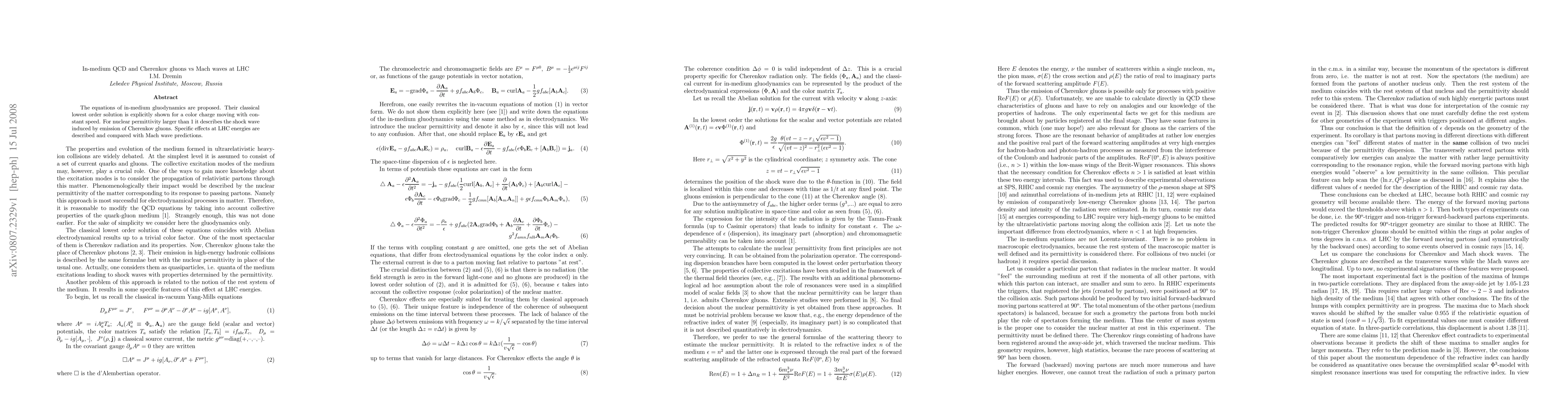 This paper proposes equations for in-medium gluodynamics and demonstrates their classical solution for a color charge moving at constant speed, describing Cherenkov gluon emission as a shock wave. It compares these effects at LHC energies with predictions from Mach wave theory.