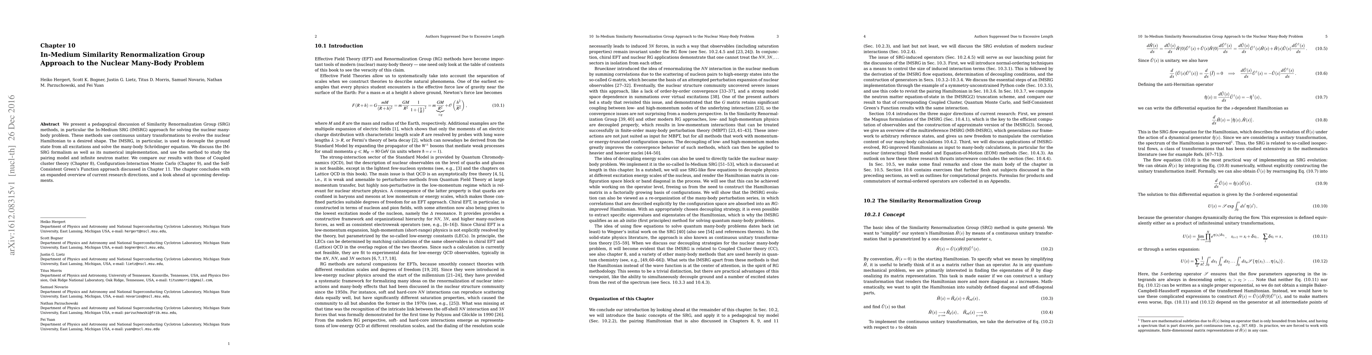 We present a pedagogical discussion of Similarity Renormalization Group (SRG) methods, in particular the In-Medium SRG (IMSRG) approach for solving the nuclear many-body problem. These methods use continuous unitary transformations to evolve the nuclear Hamiltonian to a desired shape. The IMSRG, in particular, is used to decouple the ground state from all excitations and solve the many-body Schr\"odinger equation. We discuss the IMSRG formalism as well as its numerical implementation, and use the method to study the pairing model and infinite neutron matter. We compare our results with those of Coupled cluster theory, Configuration-Interaction Monte Carlo, and the Self-Consistent Green's Function approach. The chapter concludes with an expanded overview of current research directions, and a look ahead at upcoming developments.