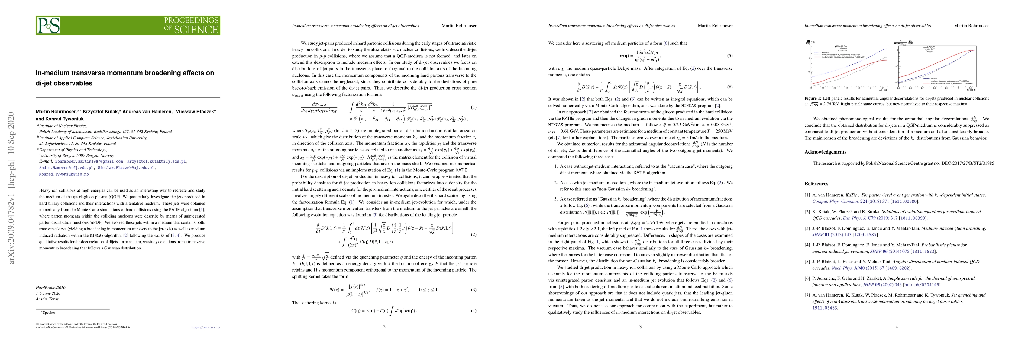 Heavy ion collisions at high energies can be used as an interesting way to recreate and study the medium of the quark-gluon plasma (QGP). We particularly investigate the jets produced in hard binary collisions and their interactions with a tentative medium. These jets were obtained numerically from the Monte-Carlo simulations of hard collisions using the KATIE-algorithm [1], where parton momenta within the colliding nucleons were describe by means of unintegrated parton distribution functions (uPDF). We evolved these jets within a medium that contains both, transverse kicks (yielding a broadening in momentum transvers to the jet-axis) as well as medium induced radiation within the MINCAS-algorithm [2] following the works of [3,4]. We produce qualitative results for the decorrelation of dijets. In particular, we study deviations from a transverse momentum broadening that follows a Gaussian distribution. [1] A. van Hameren, Comput.Phys.Commun. 224 (2018) 371-380 [2] K. Kutak, W. P{\l}aczek, R. Straka, Eur.Phys.J. C79 (2019) no.4, 317 [3] J.-P. Blaizot, F. Dominguez, E. Iancu, Y. Mehtar-Tani, JHEP 1301 (2013) 143 [4] J.-P. Blaizot, F. Dominguez, E. Iancu, Y. Mehtar-Tani, JHEP 1406 (2014) 075