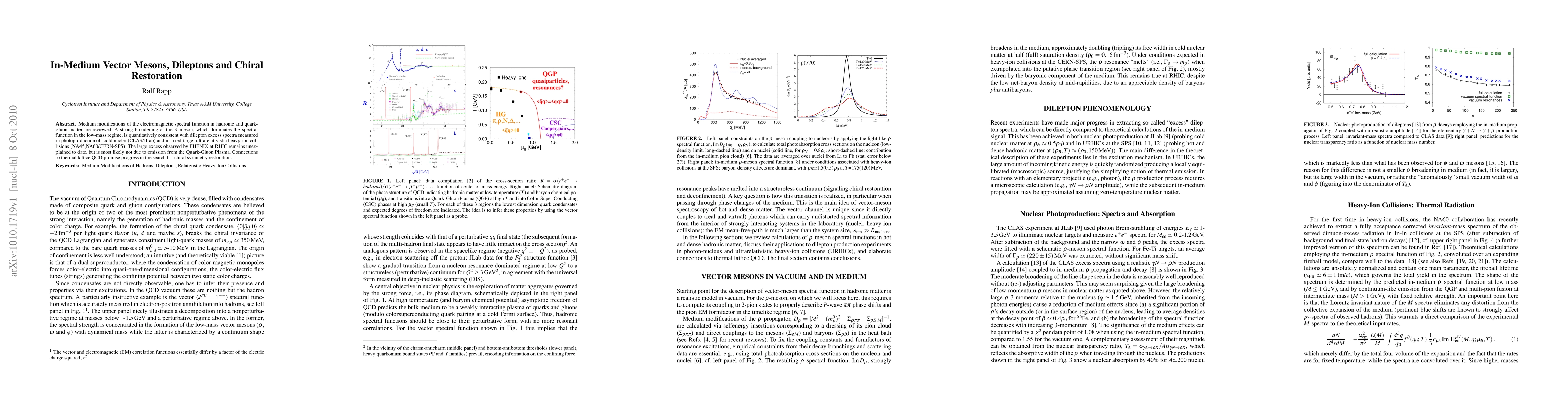 This paper reviews how vector mesons, particularly the $\rho$ meson, undergo significant broadening in medium, correlating this effect with dilepton excess observed in nuclear and heavy-ion collisions. Despite the large excess observed in RHIC experiments, it is likely not from the Quark-Gluon Plasma, and the study highlights the potential of lattice QCD to uncover chiral symmetry restoration.