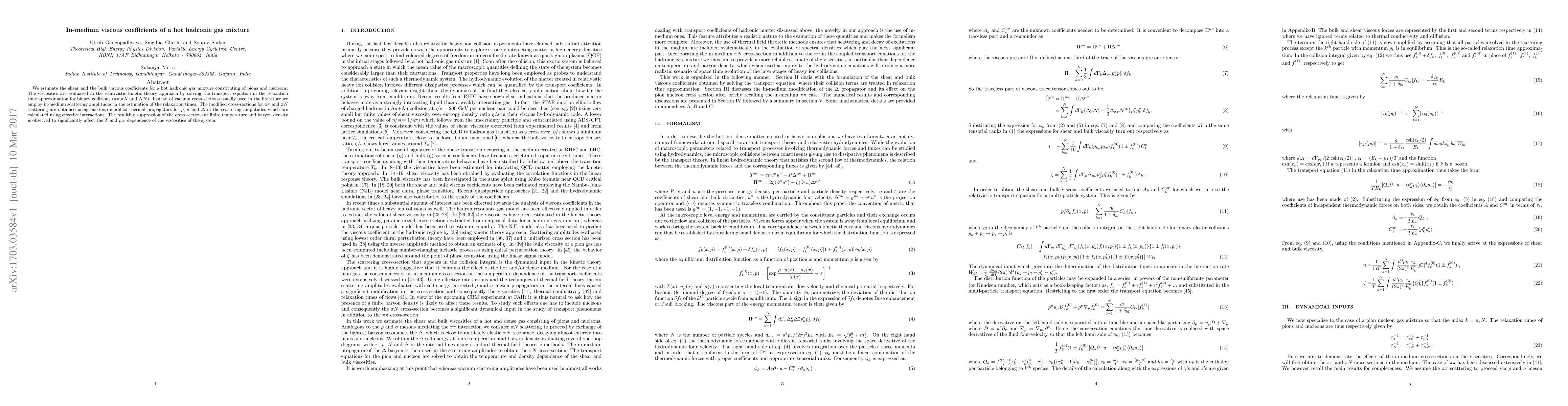 We estimate the shear and the bulk viscous coefficients for a hot hadronic gas mixture constituting of pions and nucleons. The viscosities are evaluated in the relativistic kinetic theory approach by solving the transport equation in the relaxation time approximation for binary collisions ($\pi\pi$,$\pi N$ and $NN$). Instead of vacuum cross-sections usually used in the literature we employ in-medium scattering amplitudes in the estimation of the relaxation times. The modified cross-sections for $\pi\pi$ and $\pi N$ scattering are obtained using one-loop modified thermal propagators for $\rho$, $\sigma$ and $\Delta$ in the scattering amplitudes which are calculated using effective interactions. The resulting suppression of the cross sections at finite temperature and baryon density is observed to significantly affect the $T$ and $\mu_N$ dependence of the viscosities of the system.