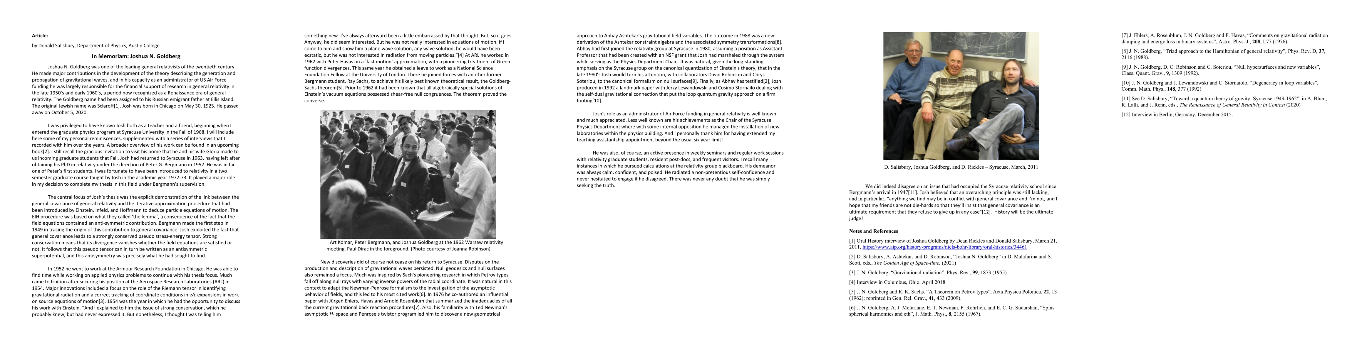 This is a short memoriam celebrating the life and work of the general relativist Joshua N. Goldberg, who passed away in October, 2020.