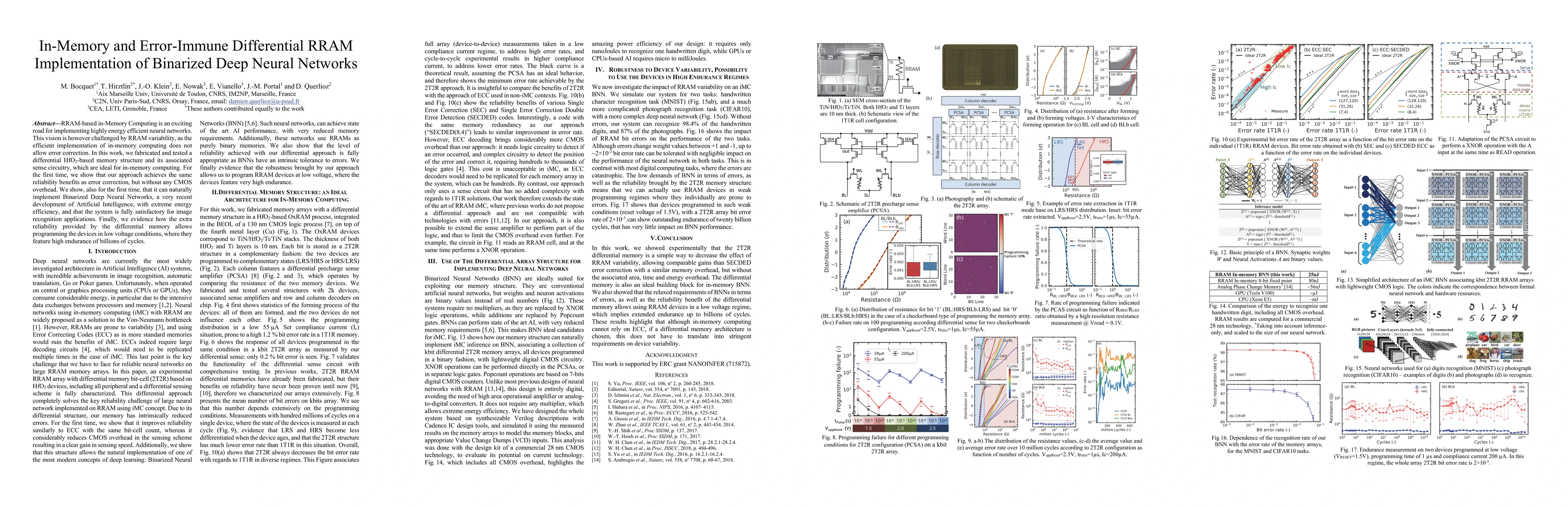 This paper presents a differential RRAM-based memory structure enabling in-memory computing for highly energy-efficient neural networks. The approach provides reliability benefits comparable to error correction without CMOS overhead, effectively implementing binarized deep neural networks with excellent energy efficiency and satisfactory performance for image recognition.