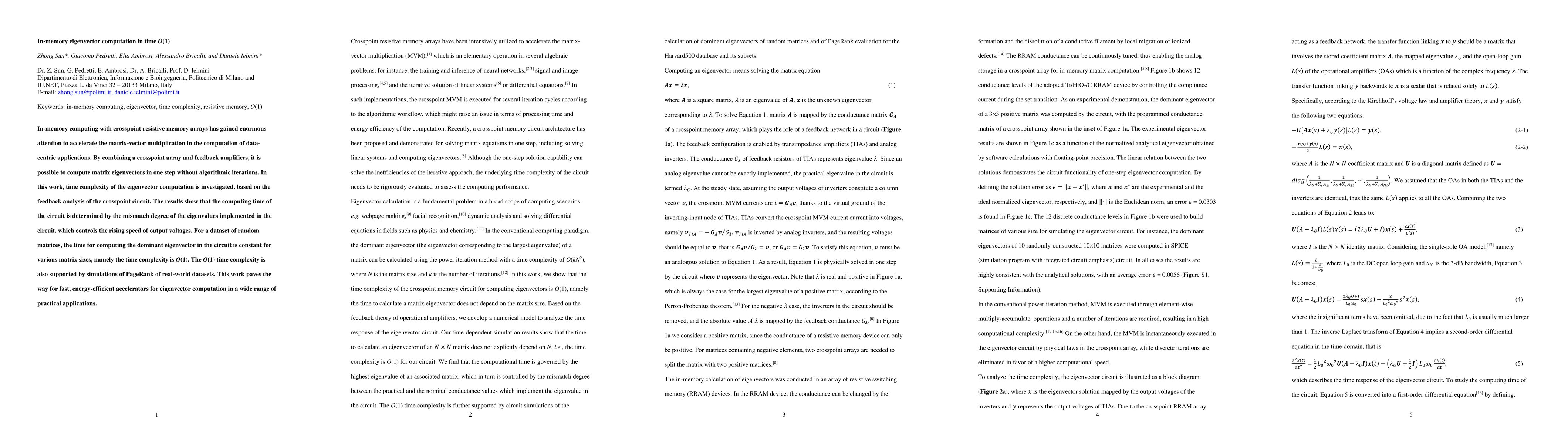 Researchers demonstrate that in-memory eigenvector computation can be done in constant time (O(1)) using a crosspoint resistive memory array and feedback amplifiers, paving the way for fast and energy-efficient accelerators.