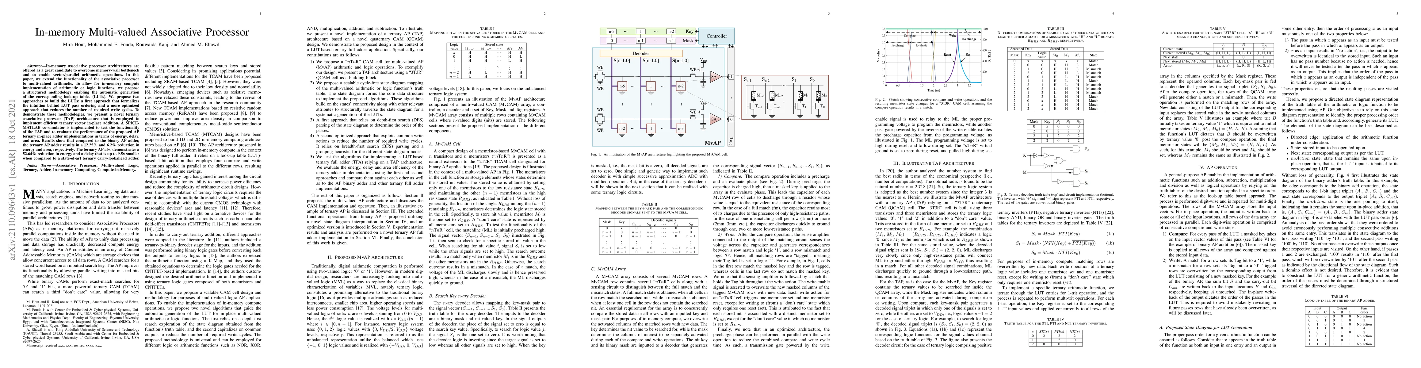This paper proposes an in-memory multi-valued associative processor architecture to tackle memory-wall bottlenecks and enhance vector/parallel arithmetic operations. It introduces a methodology for generating look-up tables to implement multi-valued arithmetic, demonstrating a novel ternary associative processor (TAP) that achieves significant reductions in energy and area compared to binary and state-of-the-art ternary adders.
