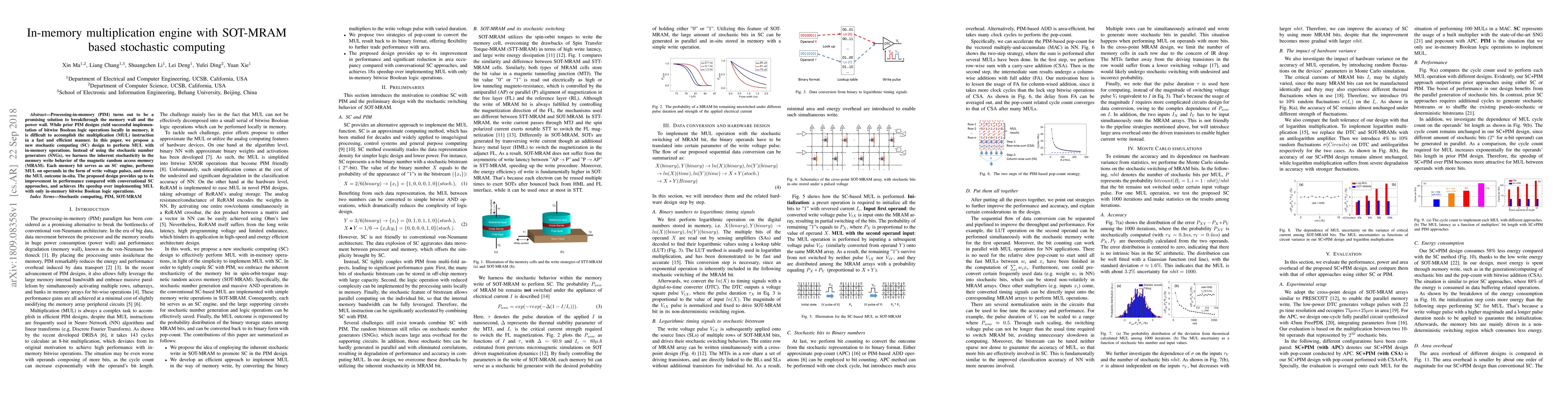 This paper proposes an in-memory multiplication engine using stochastic computing with SOT-MRAM, leveraging the stochasticity of MRAM write behavior to perform multiplications in-situ, achieving up to 4x performance improvement over conventional stochastic methods and an 18x speedup over bitwise Boolean logic operations.