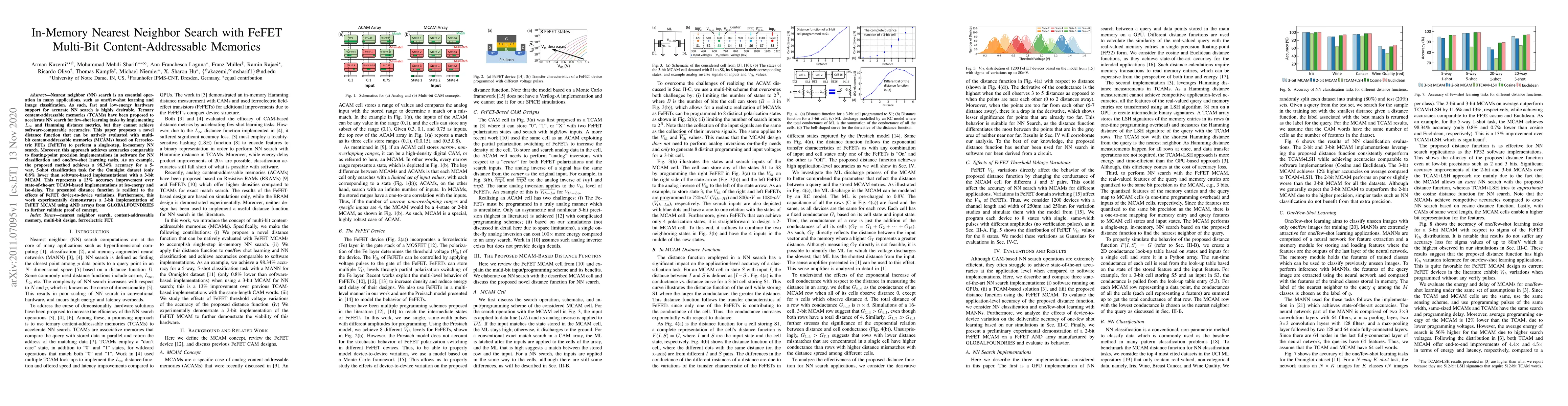 This paper proposes a novel distance function for in-memory nearest neighbor search using multi-bit ferroelectric FET (FeFET) content-addressable memories (MCAMs), achieving high accuracy comparable to software implementations. The method demonstrates a 98.34% accuracy for 5-way, 5-shot classification, outperforming state-of-the-art TCAM-based approaches.