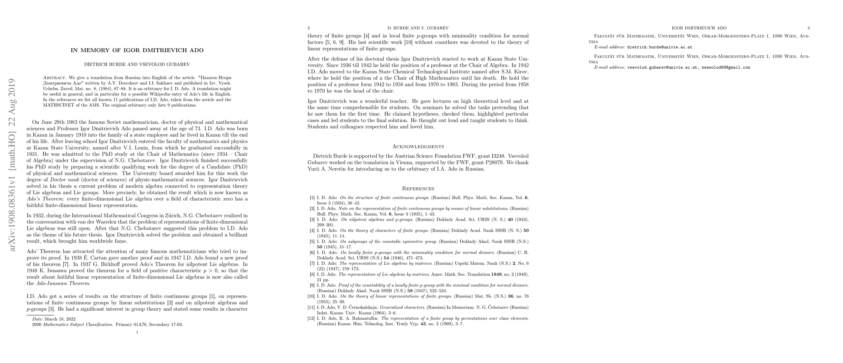 We give a translation from Russian into English of the article "In memory of Igor Dmitrievich Ado" written by A.V. Dorodnov and I.I. Sakhaev and published in Izv.\ Vyssh.\ Uchebn.\ Zaved.\ Mat.\ no. 8, (1984), 87--88. It is an orbituary for I. D. Ado. A translation might be useful in general, and in particular for a possible Wikipedia entry of Ado's life in English. In the references we list all known $12$ publications of I.D. Ado, taken from the article and the MATHSCINET of the AMS. The original orbituary only lists $9$ publications.
