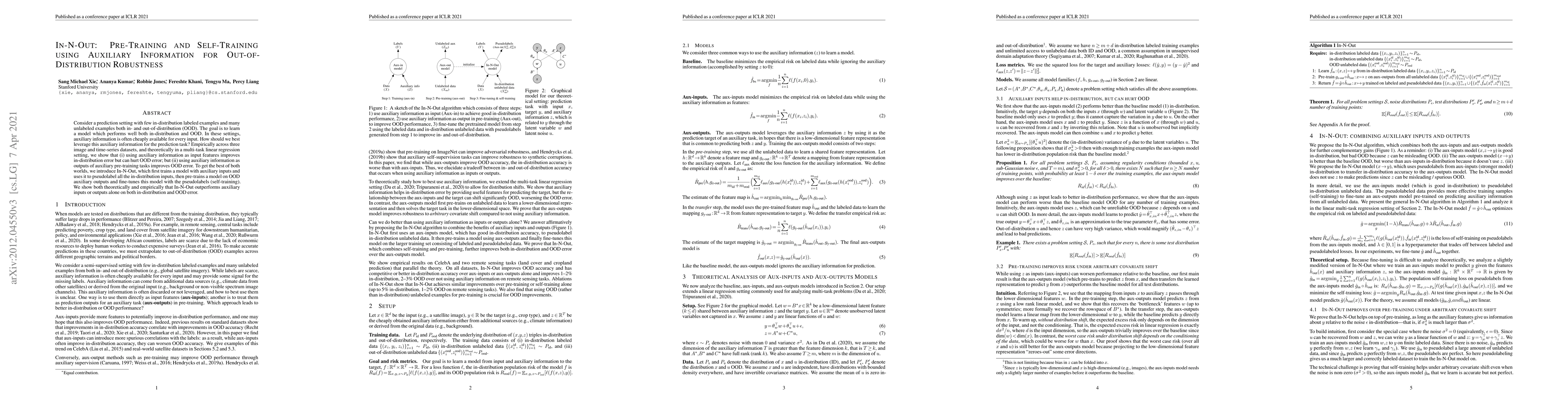 Consider a prediction setting with few in-distribution labeled examples and many unlabeled examples both in- and out-of-distribution (OOD). The goal is to learn a model which performs well both in-distribution and OOD. In these settings, auxiliary information is often cheaply available for every input. How should we best leverage this auxiliary information for the prediction task? Empirically across three image and time-series datasets, and theoretically in a multi-task linear regression setting, we show that (i) using auxiliary information as input features improves in-distribution error but can hurt OOD error; but (ii) using auxiliary information as outputs of auxiliary pre-training tasks improves OOD error. To get the best of both worlds, we introduce In-N-Out, which first trains a model with auxiliary inputs and uses it to pseudolabel all the in-distribution inputs, then pre-trains a model on OOD auxiliary outputs and fine-tunes this model with the pseudolabels (self-training). We show both theoretically and empirically that In-N-Out outperforms auxiliary inputs or outputs alone on both in-distribution and OOD error.