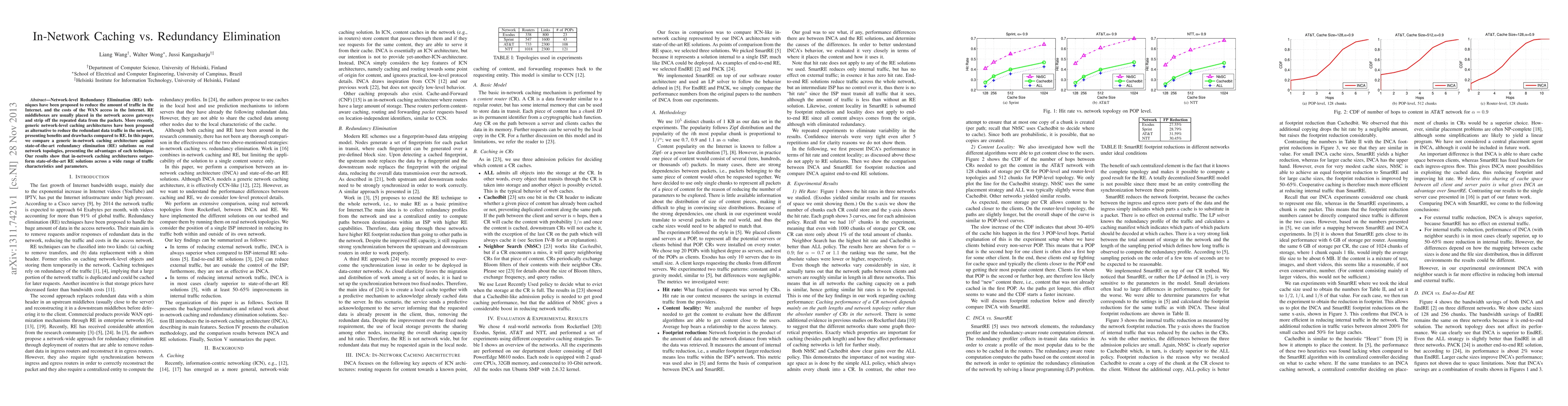 Network-level Redundancy Elimination (RE) techniques have been proposed to reduce the amount of traffic in the Internet. and the costs of the WAN access in the Internet. RE middleboxes are usually placed in the network access gateways and strip off the repeated data from the packets. More recently, generic network-level caching architectures have been proposed as alternative to reduce the redundant data traffic in the network, presenting benefits and drawbacks compared to RE. In this paper, we compare a generic in-network caching architecture against state-of-the-art redundancy elimination (RE) solutions on real network topologies, presenting the advantages of each technique. Our results show that in-network caching architectures outperform state-of-the-art RE solutions across a wide range of traffic characteristics and parameters.