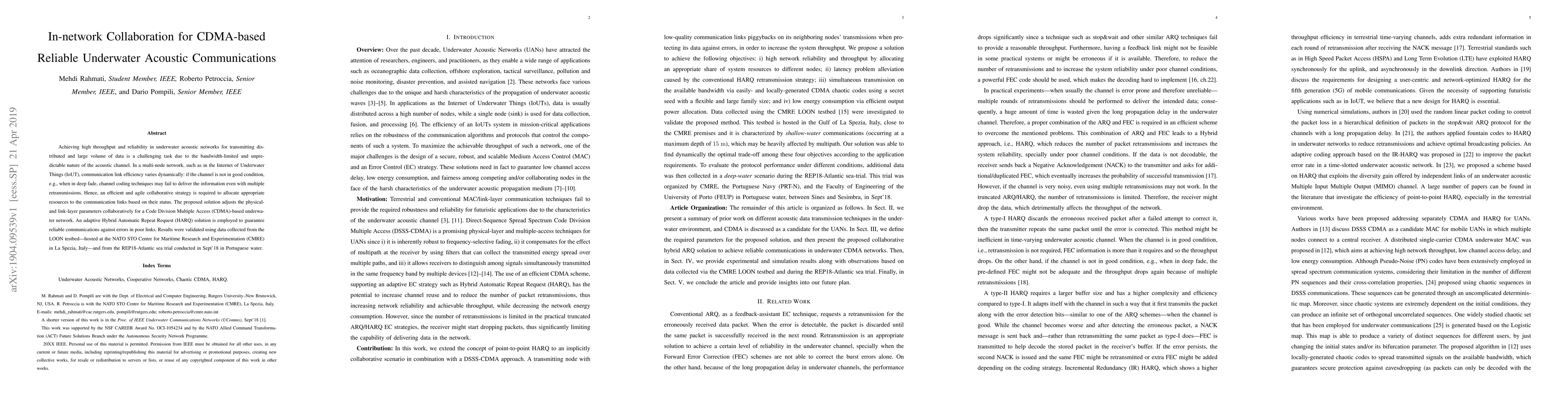 This paper proposes an adaptive collaborative strategy for enhancing reliability and throughput in CDMA-based underwater acoustic networks, employing an adaptive Hybrid Automatic Repeat Request (HARQ) solution to manage errors in poor communication links. Results from the LOON testbed and REP18-Atlantic sea trial demonstrate its effectiveness.
