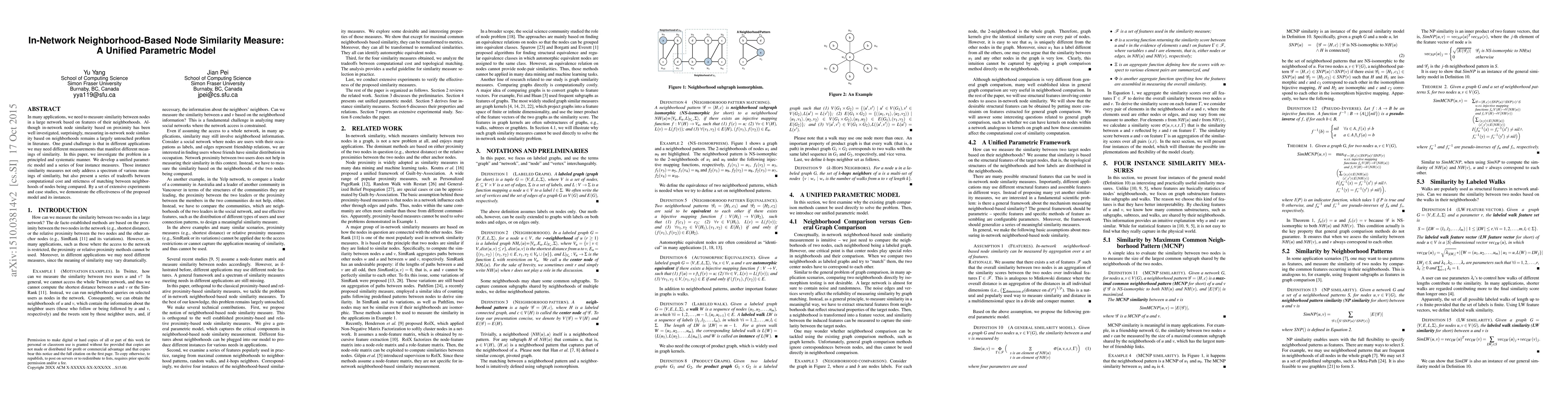 This paper develops a unified parametric model to measure in-network node similarity based on neighborhoods, offering various tradeoffs between computational cost and strictness of matching. It demonstrates the effectiveness of the proposed model through extensive experiments and case studies.
