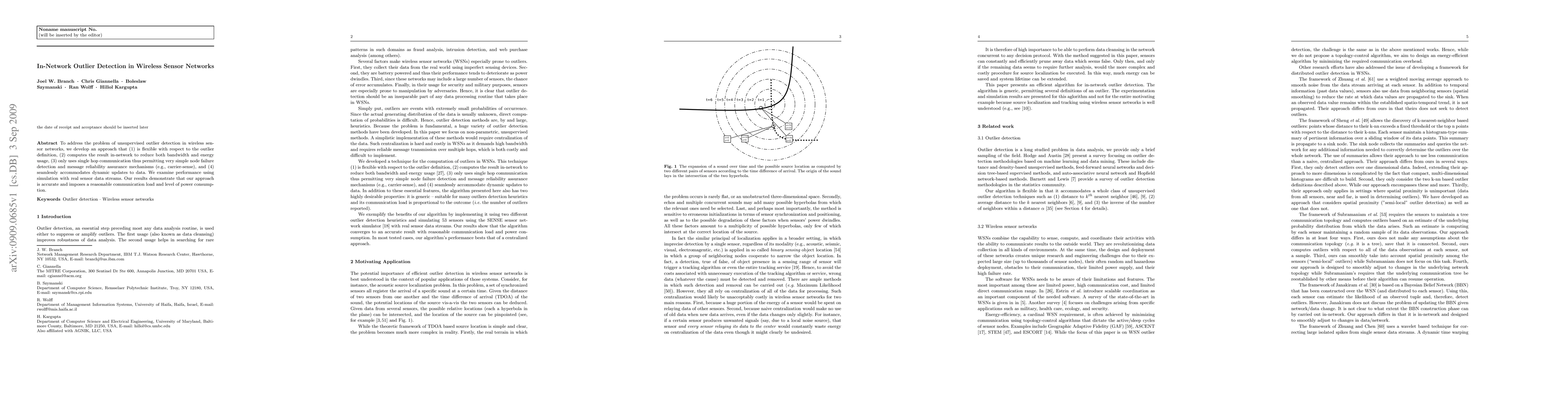 This paper proposes an in-network method for unsupervised outlier detection in wireless sensor networks that is flexible, reduces bandwidth and energy usage, and accommodates dynamic updates. Simulation results show the approach is accurate with minimal communication load and power consumption.