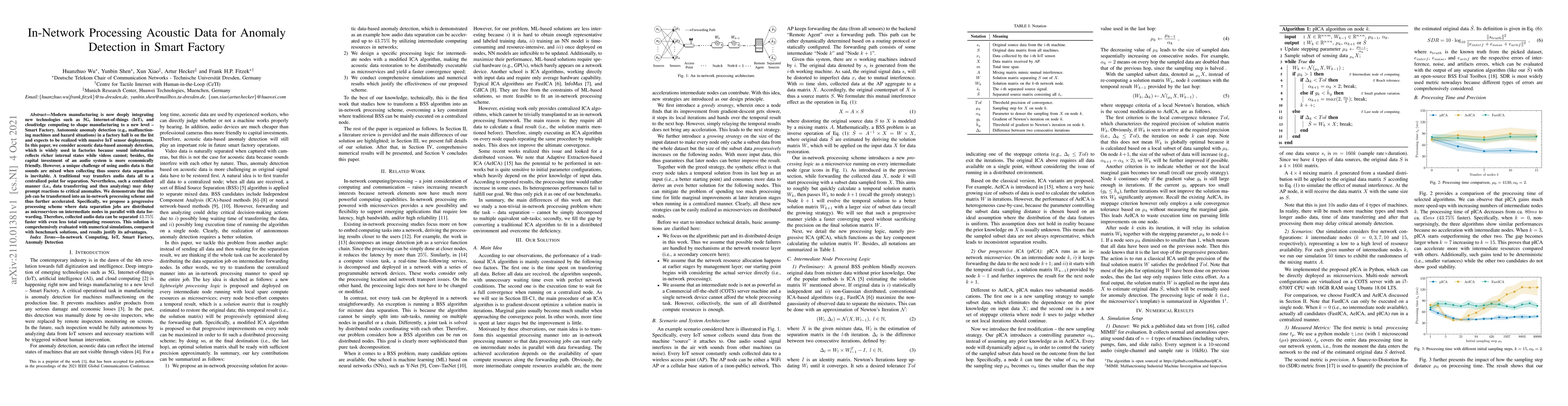 Modern manufacturing is now deeply integrating new technologies such as 5G, Internet-of-things (IoT), and cloud/edge computing to shape manufacturing to a new level -- Smart Factory. Autonomic anomaly detection (e.g., malfunctioning machines and hazard situations) in a factory hall is on the list and expects to be realized with massive IoT sensor deployments. In this paper, we consider acoustic data-based anomaly detection, which is widely used in factories because sound information reflects richer internal states while videos cannot; besides, the capital investment of an audio system is more economically friendly. However, a unique challenge of using audio data is that sounds are mixed when collecting thus source data separation is inevitable. A traditional way transfers audio data all to a centralized point for separation. Nevertheless, such a centralized manner (i.e., data transferring and then analyzing) may delay prompt reactions to critical anomalies. We demonstrate that this job can be transformed into an in-network processing scheme and thus further accelerated. Specifically, we propose a progressive processing scheme where data separation jobs are distributed as microservices on intermediate nodes in parallel with data forwarding. Therefore, collected audio data can be separated 43.75% faster with even less total computing resources. This solution is comprehensively evaluated with numerical simulations, compared with benchmark solutions, and results justify its advantages.