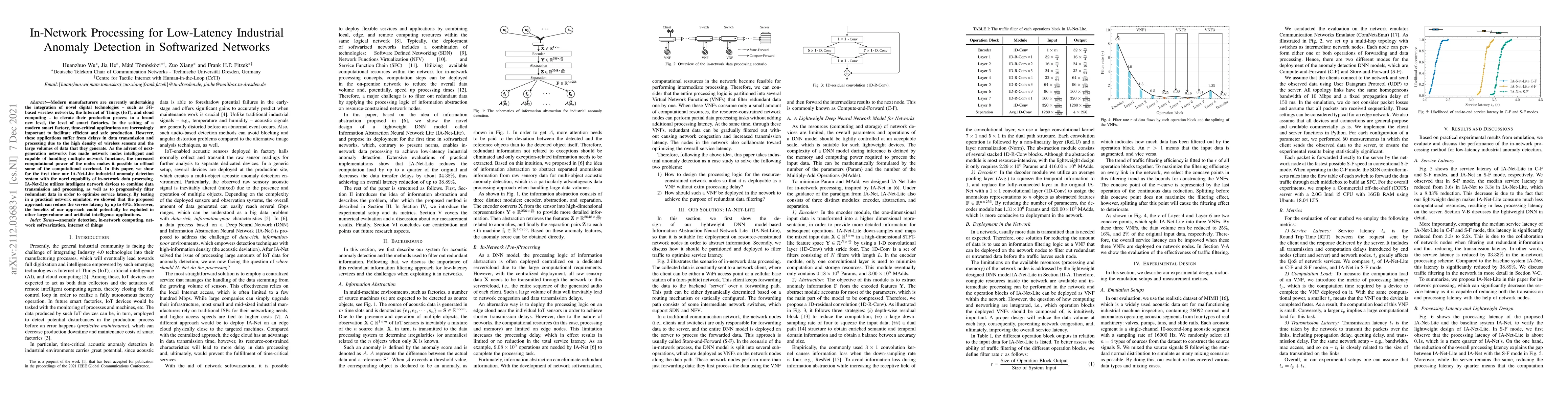 Modern manufacturers are currently undertaking the integration of novel digital technologies - such as 5G-based wireless networks, the Internet of Things (IoT), and cloud computing - to elevate their production process to a brand new level, the level of smart factories. In the setting of a modern smart factory, time-critical applications are increasingly important to facilitate efficient and safe production. However, these applications suffer from delays in data transmission and processing due to the high density of wireless sensors and the large volumes of data that they generate. As the advent of next-generation networks has made network nodes intelligent and capable of handling multiple network functions, the increased computational power of the nodes makes it possible to offload some of the computational overhead. In this paper, we show for the first time our IA-Net-Lite industrial anomaly detection system with the novel capability of in-network data processing. IA-Net-Lite utilizes intelligent network devices to combine data transmission and processing, as well as to progressively filter redundant data in order to optimize service latency. By testing in a practical network emulator, we showed that the proposed approach can reduce the service latency by up to 40%. Moreover, the benefits of our approach could potentially be exploited in other large-volume and artificial intelligence applications.