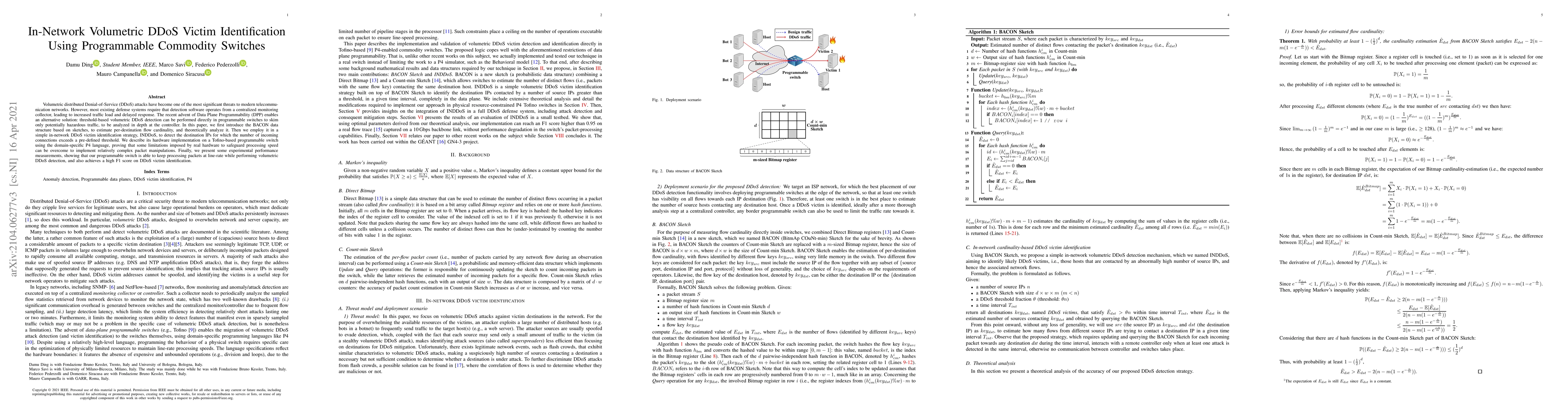 Volumetric distributed Denial-of-Service (DDoS) attacks have become one of the most significant threats to modern telecommunication networks. However, most existing defense systems require that detection software operates from a centralized monitoring collector, leading to increased traffic load and delayed response. The recent advent of Data Plane Programmability (DPP) enables an alternative solution: threshold-based volumetric DDoS detection can be performed directly in programmable switches to skim only potentially hazardous traffic, to be analyzed in depth at the controller. In this paper, we first introduce the BACON data structure based on sketches, to estimate per-destination flow cardinality, and theoretically analyze it. Then we employ it in a simple in-network DDoS victim identification strategy, INDDoS, to detect the destination IPs for which the number of incoming connections exceeds a pre-defined threshold. We describe its hardware implementation on a Tofino-based programmable switch using the domain-specific P4 language, proving that some limitations imposed by real hardware to safeguard processing speed can be overcome to implement relatively complex packet manipulations. Finally, we present some experimental performance measurements, showing that our programmable switch is able to keep processing packets at line-rate while performing volumetric DDoS detection, and also achieves a high F1 score on DDoS victim identification.
