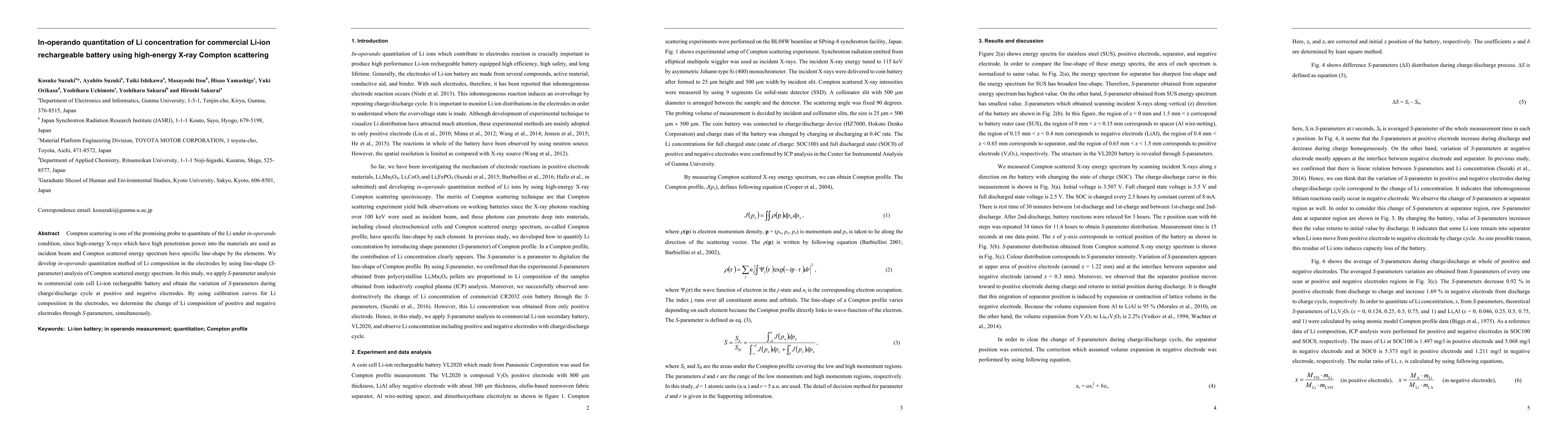 This study develops an in-operando method using high-energy X-ray Compton scattering to quantify lithium concentration in commercial Li-ion batteries. The method employs S-parameter analysis of Compton scattered spectra to determine lithium composition changes during charge/discharge cycles.