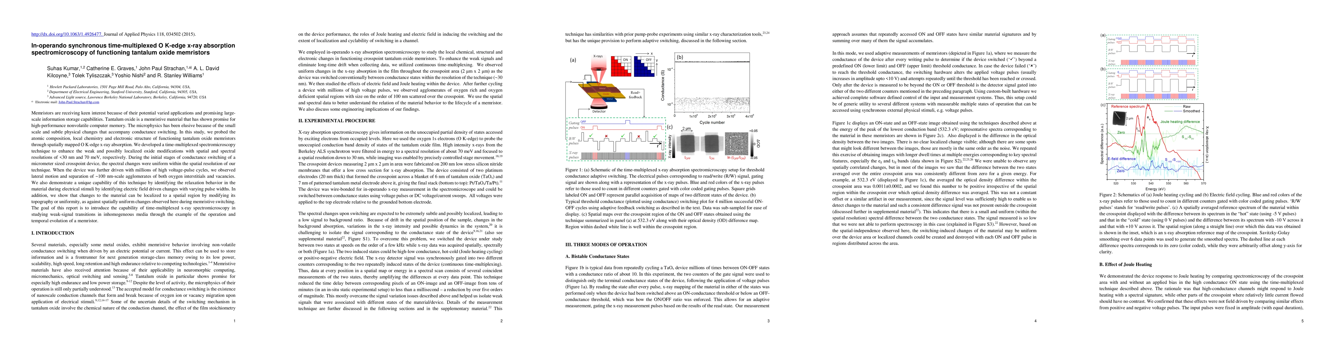 This study employs time-multiplexed O K-edge x-ray absorption spectromicroscopy to investigate the atomic composition and electronic structure of functioning tantalum oxide memristors, revealing uniform initial conductance switching and later localized oxygen interstitial and vacancy agglomerates. The technique also demonstrates the ability to track material relaxation and spatially localized changes.