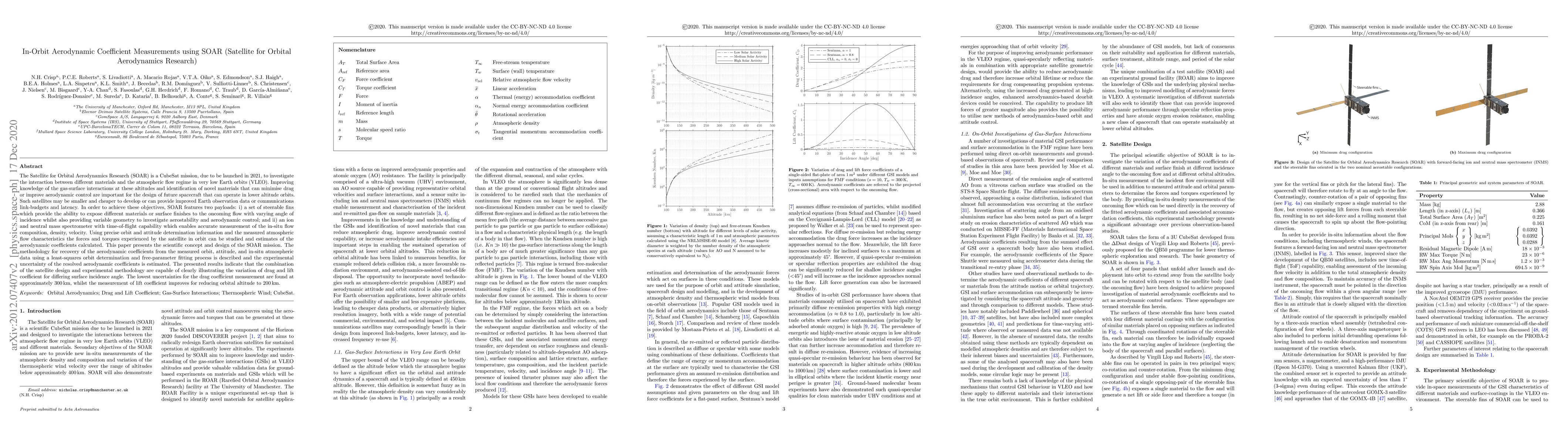The SOAR CubeSat mission aims to measure aerodynamic coefficients in very low Earth orbits by analyzing gas-surface interactions and material performance. The methodology for determining these coefficients through orbit and attitude data, along with atmospheric measurements, shows promising accuracy, with lower uncertainties in drag coefficient measurements at 300 km and lift coefficient at 200 km.