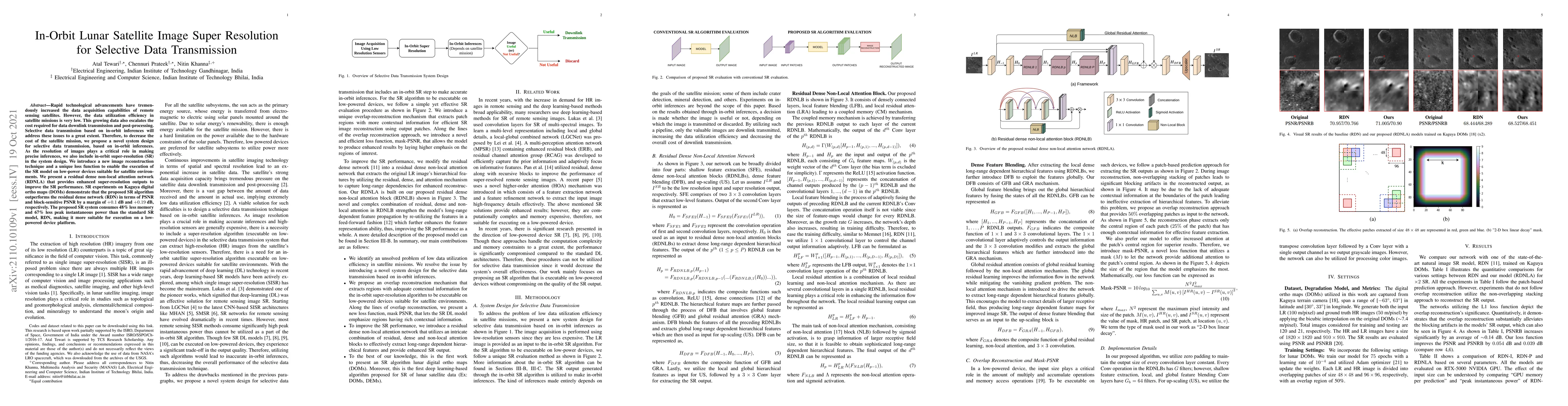 This paper proposes a novel system for selective data transmission from lunar satellites, incorporating in-orbit super-resolution (SR) to enhance image resolution and improve inference efficiency. The introduced residual dense non-local attention network (RDNLA) outperforms existing models in SR performance while significantly reducing memory and power consumption, making it suitable for low-power satellite devices.