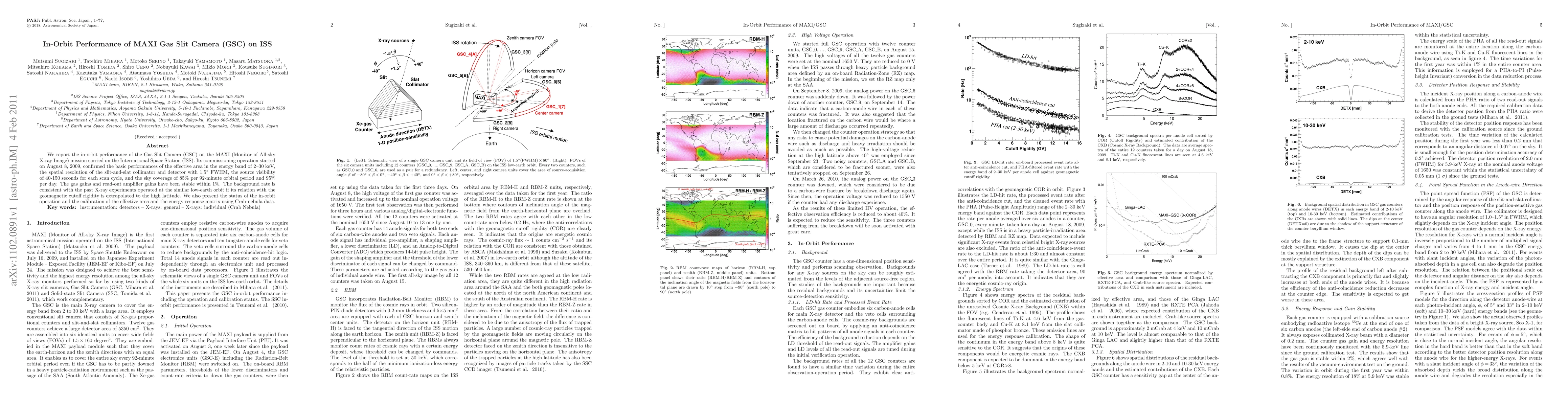 The MAXI Gas Slit Camera (GSC) on the ISS has demonstrated stable performance with effective area, spatial resolution, and background rate consistent with expectations, achieving 85% sky coverage per orbit and 95% daily. Calibration using Crab-nebula data confirms operational stability.