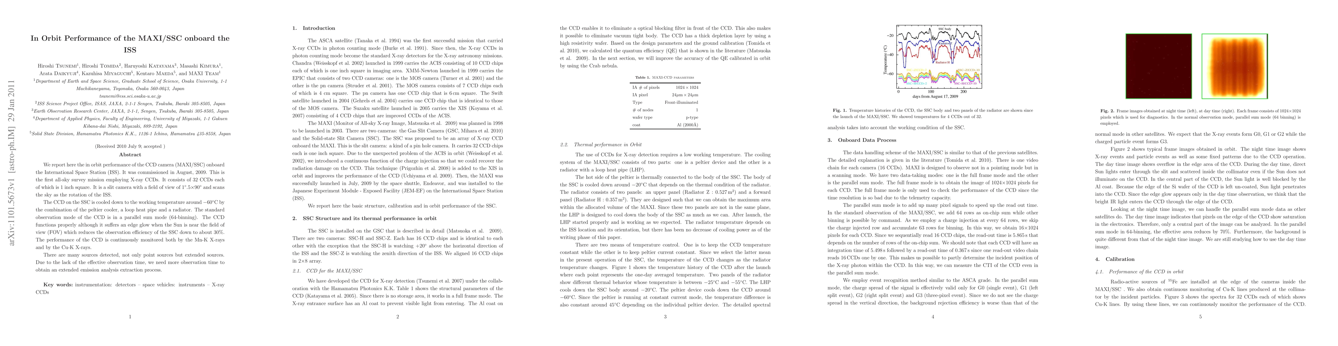 We report here the in orbit performance of the CCD camera (MAXI/SSC) onboard the International Space Station (ISS). It was commissioned in August, 2009. This is the first all-sky survey mission employing X-ray CCDs. It consists of 32 CCDs each of which is 1 inch square. It is a slit camera with a field of view of 1deg.5x 90deg and scans the sky as the rotation of the ISS. The CCD on the SSC is cooled down to the working temperature around -60degC by the combination of the peltier cooler, a loop heat pipe and a radiator. The standard observation mode of the CCD is in a parallel sum mode (64-binning). The CCD functions properly although it suffers an edge glow when the Sun is near the field of view (FOV) which reduces the observation efficiency of the SSC down to about 30%. The performance of the CCD is continuously monitored both by the Mn-K X-rays and by the Cu-K X-rays. There are many sources detected, not only point sources but extended sources. Due to the lack of the effective observation time, we need more observation time to obtain an extended emission analysis extraction process.