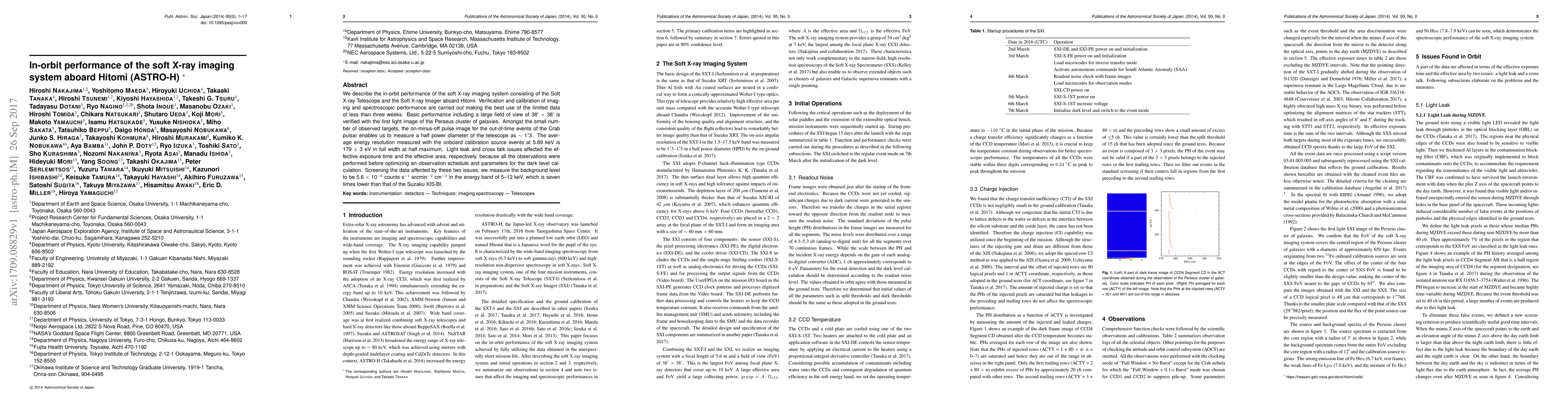 The soft X-ray imaging system aboard Hitomi (ASTRO-H) demonstrated basic performance verification with a large field of view and a half power diameter of 1.3'. Despite light leak and cross talk issues, the system achieved a background level seven times lower than Suzaku XIS-BI.