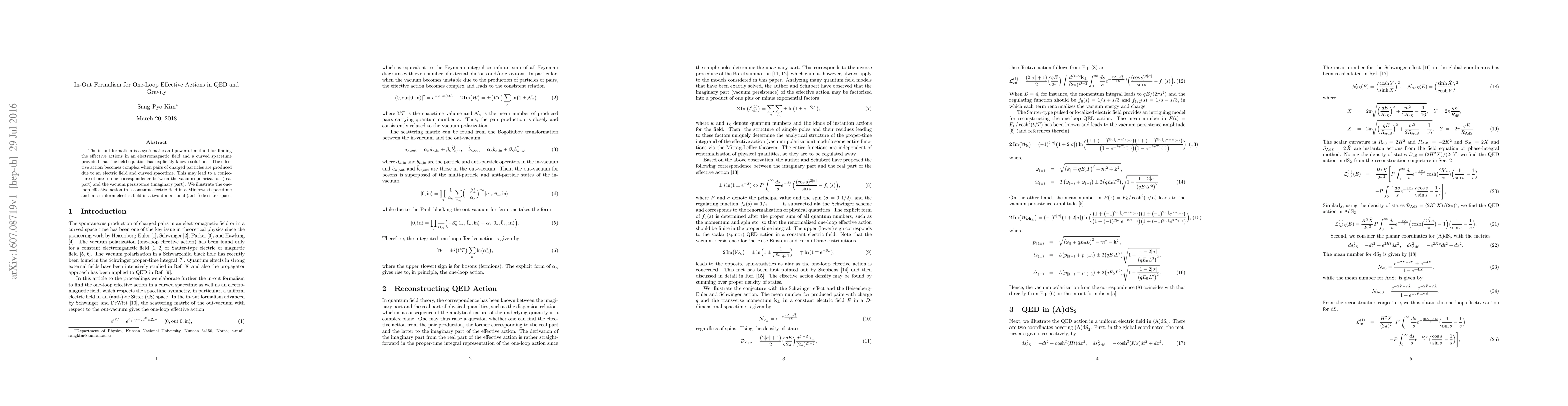 The in-out formalism is a systematic and powerful method for finding the effective actions in an electromagnetic field and a curved spacetime provided that the field equation has explicitly known solutions. The effective action becomes complex when pairs of charged particles are produced due to an electric field and curved spacetime. This may lead to a conjecture of one-to-one correspondence between the vacuum polarization (real part) and the vacuum persistence (imaginary part). We illustrate the one-loop effective action in a constant electric field in a Minkowski spacetime and in a uniform electric field in a two-dimensional (anti-) de sitter space.
